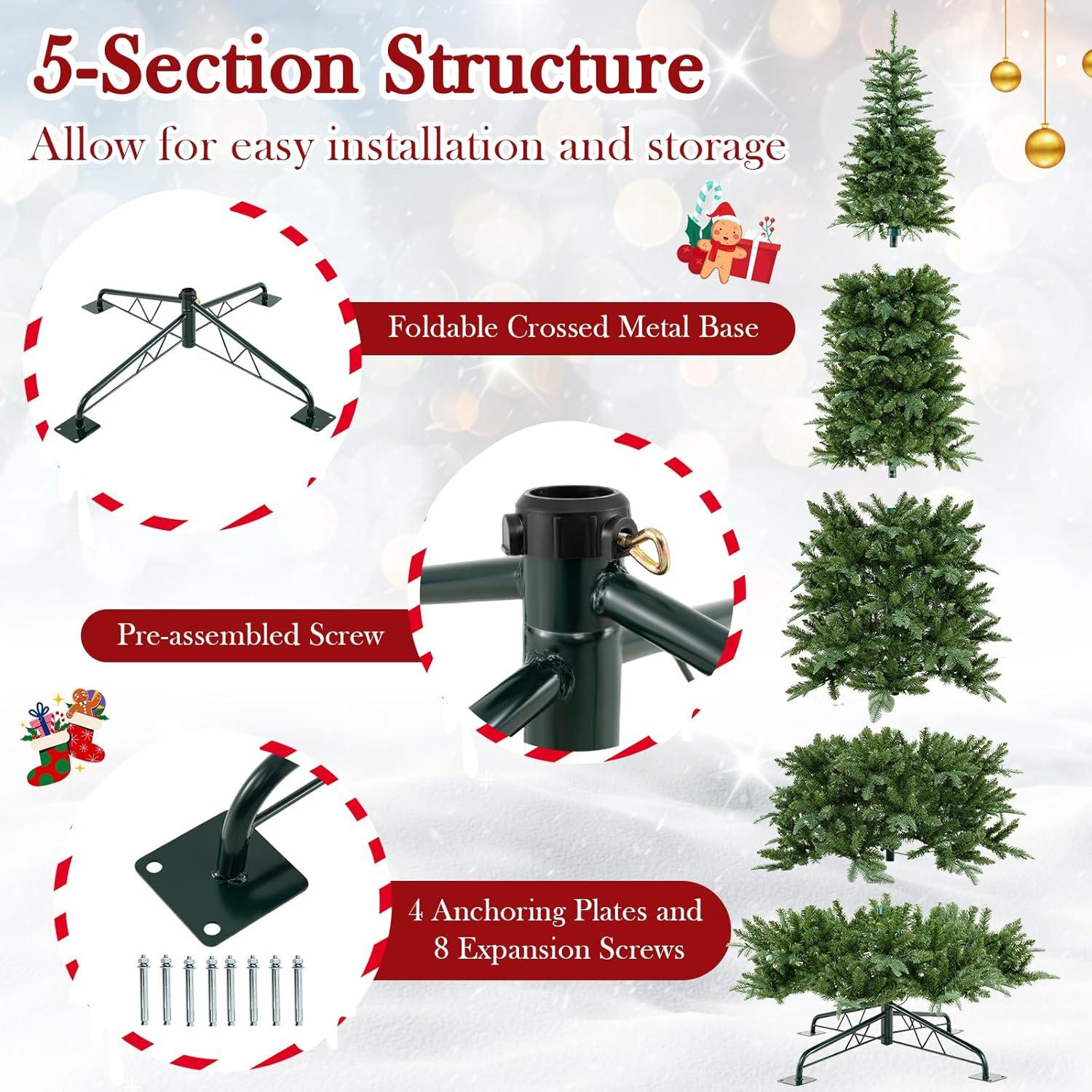 Easy Assembly: This holiday tree is segmented into 5 sections and a base, and branches are connected to the trunk by flexible hinges that lock automatically into place, making assembly a breeze. Additionally, the foldable base with a pre-assembled screw eliminates the need for aligning holes, making it easy to secure.