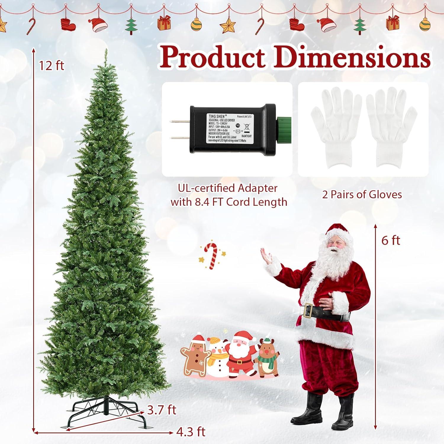 Goplus 12 FT Tall Pre-Lit Slim Pencil Christmas Tree, Artificial Hinged Xmas Tree with 2840 Branch Tips, 1000 Warm White LED Lights, Foldable Stand, Outdoor Indoor Home Office Holiday Party Decoration(Style C)
