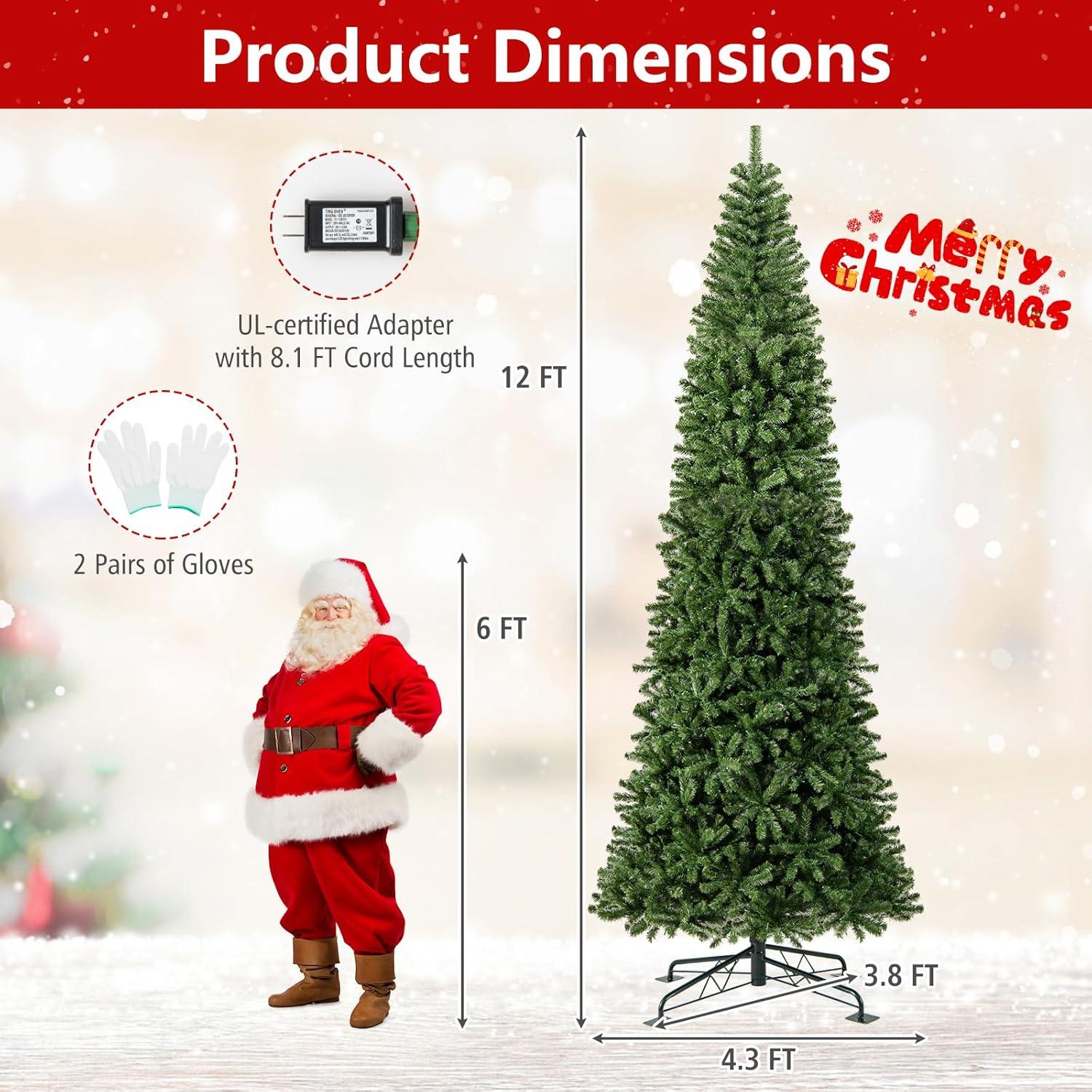 Goplus 12 FT Tall Pre-Lit Slim Pencil Christmas Tree, Artificial Hinged Xmas Tree with 2840 Branch Tips, 1000 Warm White LED Lights, Foldable Stand, Outdoor Indoor Home Office Holiday Party Decoration(Style D)