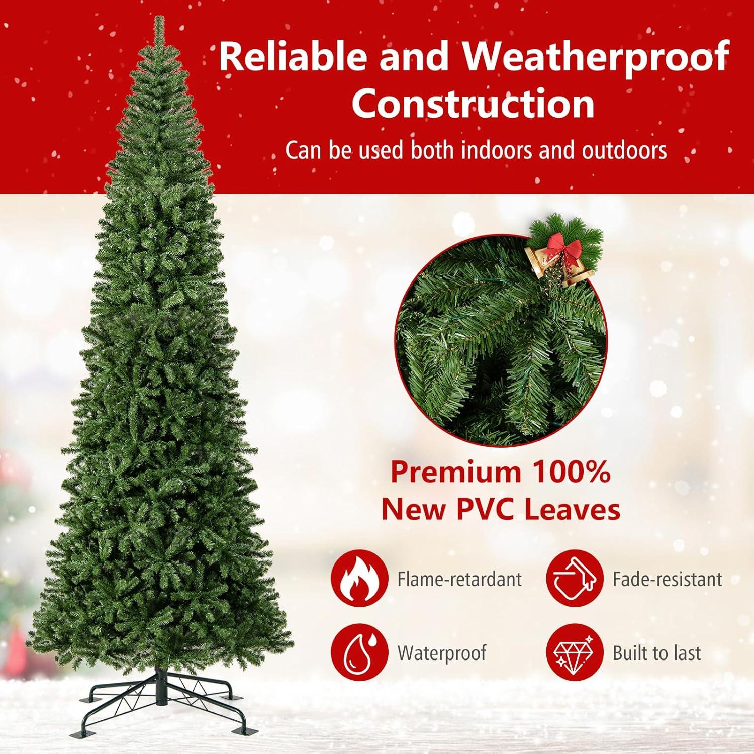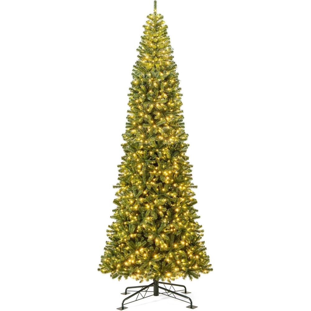 Goplus 12 FT Tall Pre-Lit Slim Pencil Christmas Tree, Artificial Hinged Xmas Tree with 2840 Branch Tips, 1000 Warm White LED Lights, Foldable Stand, Outdoor Indoor Home Office Holiday Party Decoration(Style C)