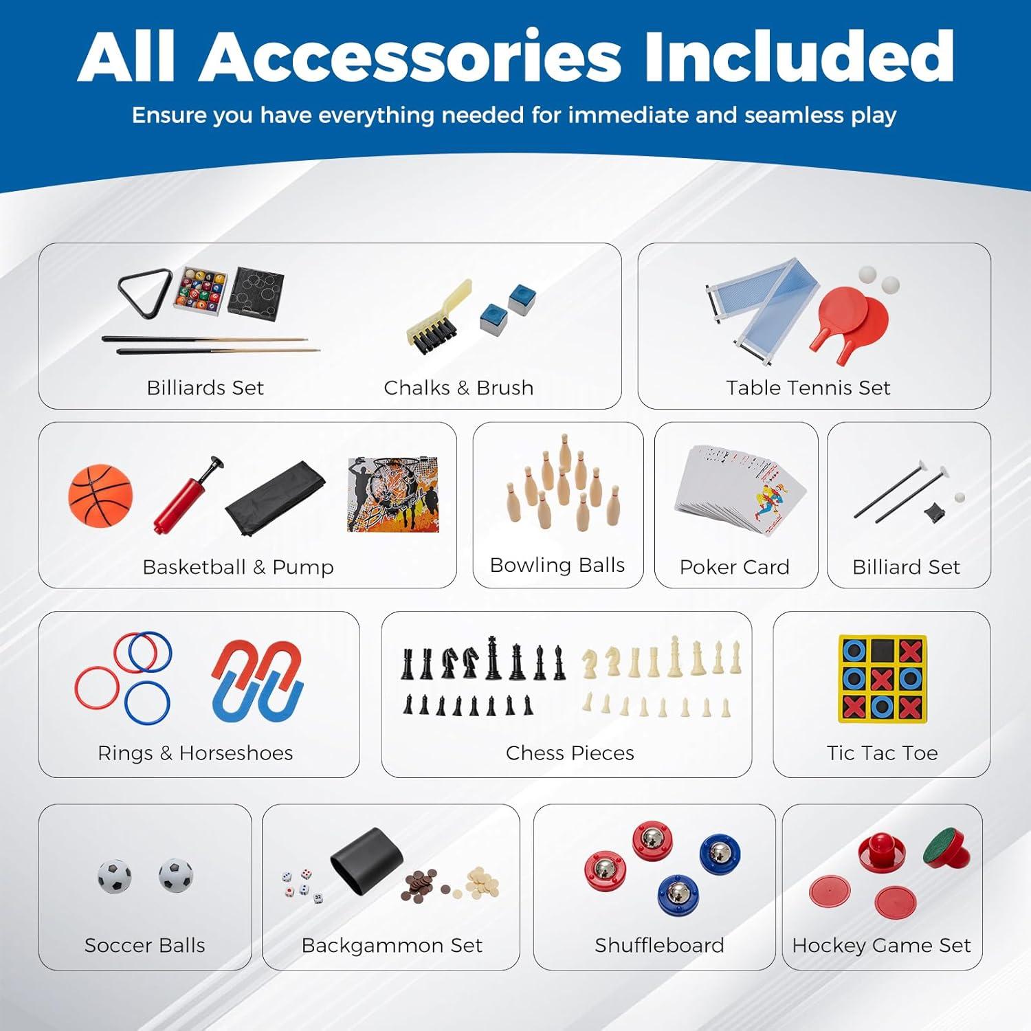 🎁【14 in 1 Game Table Set】 Featuring 7 exciting ball games, 5 board games and 2 toss games including foosball, hockey, billiards, table tennis, bowling, shuffleboard, chess, backgammon, checkers, poker & dice, ring toss, horseshoes, basketball, and tic tac toe. This 14 in 1 game table set will surely offer you endless fun.