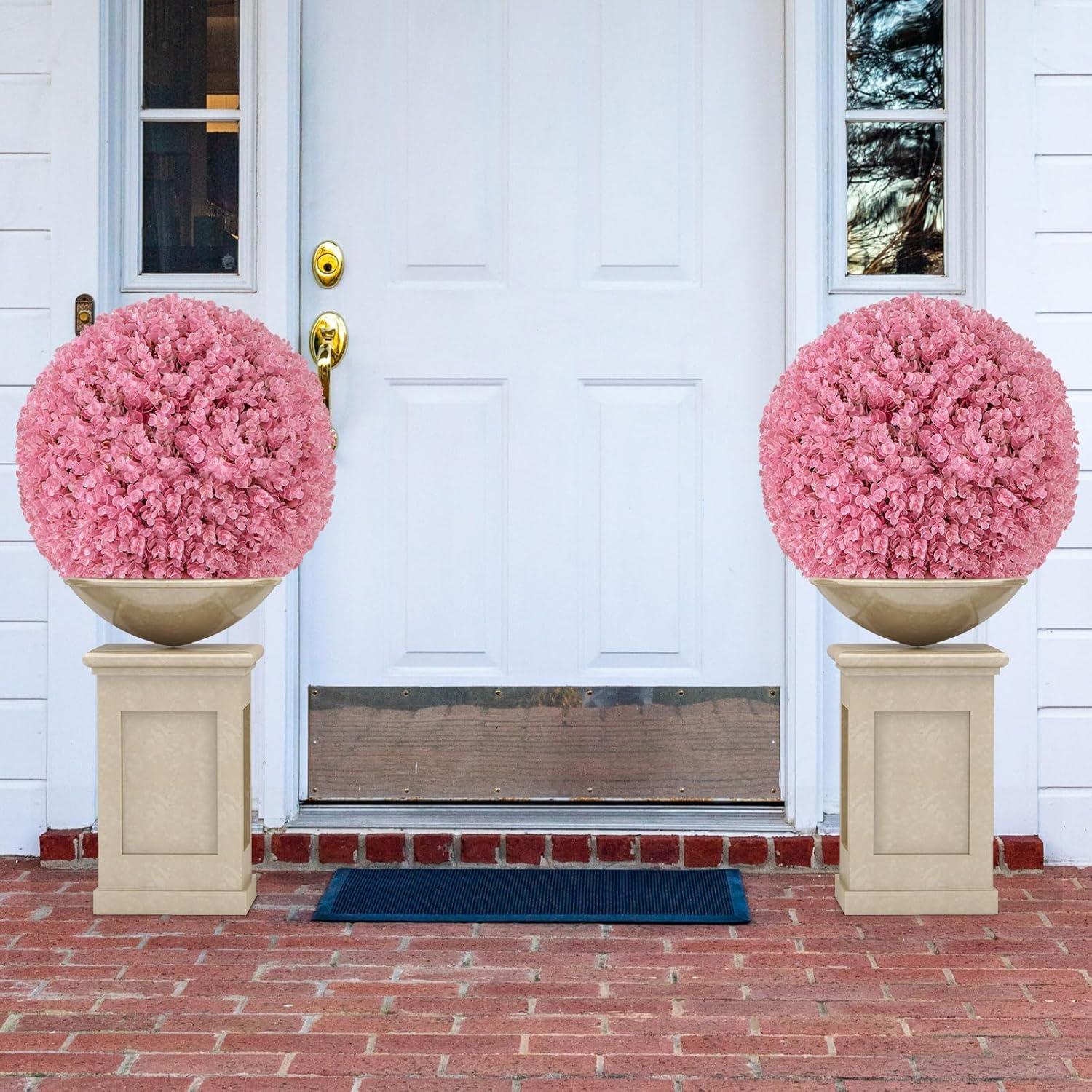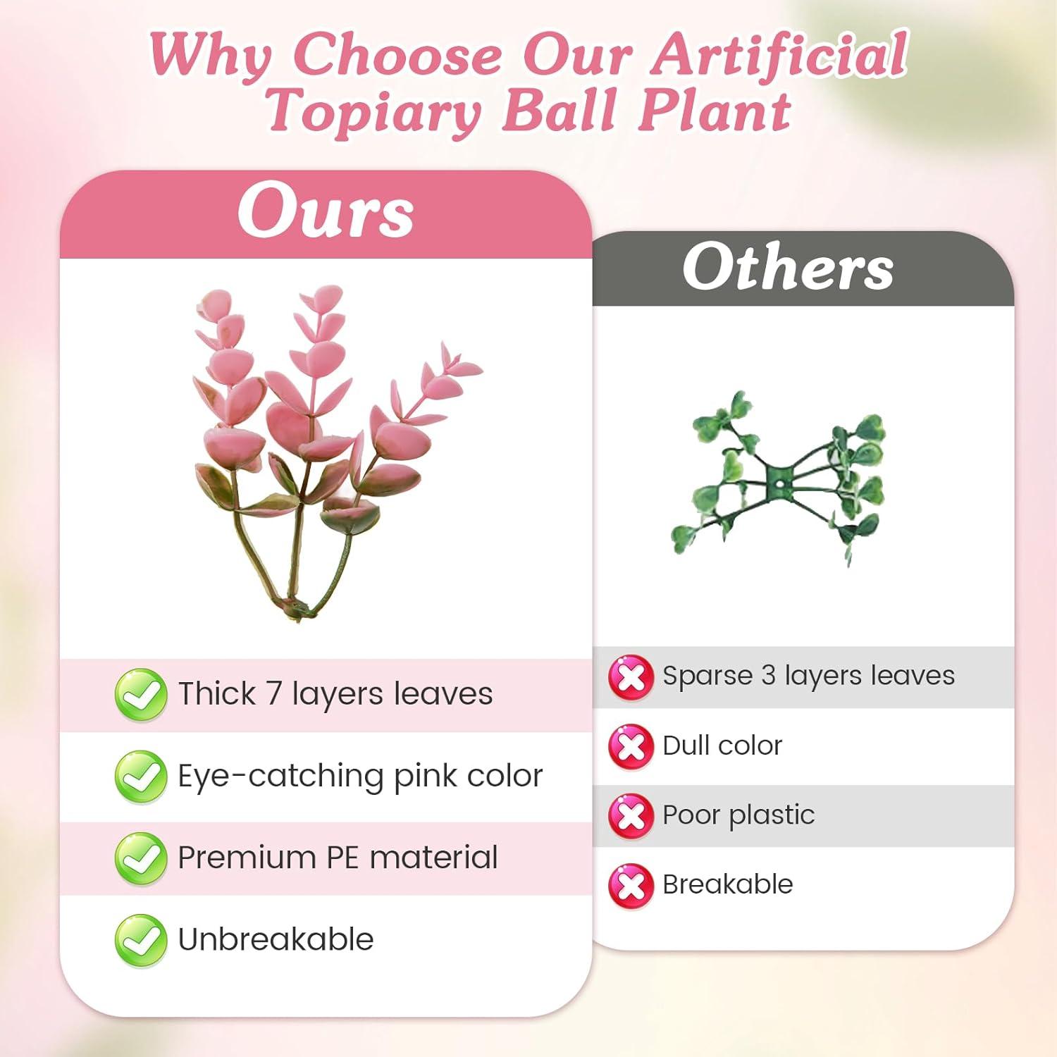 Why choose our artificial topiary ball plant? Unlike others with sparse 3-layers leaves, ours features 7-layer pink realistic eucalyptus leaves, which are sure to impress who lays an eye on it. Made of sun-proof and smell-free PE material, the faux green ball plant is suitable for indoors and outdoors. Furthermore, the faux topiary ball requires no maintenance, which is energy-saving. Whether you're hosting a party, sprucing up your garden, adding a touch of greenery to a restaurant, the artificial plant topiary balls offer multiple display options to suit your needs, such as hanging or putting on the floor. In addition, you can put it in a round and square flower pot with a top opening over 18”. It is easy to install the fake indoor outdoor ball plant by connecting the clips. How to restore the shape if deformed? Please put it in the sun or blow it with a hair dryer for a while to restore its shape.