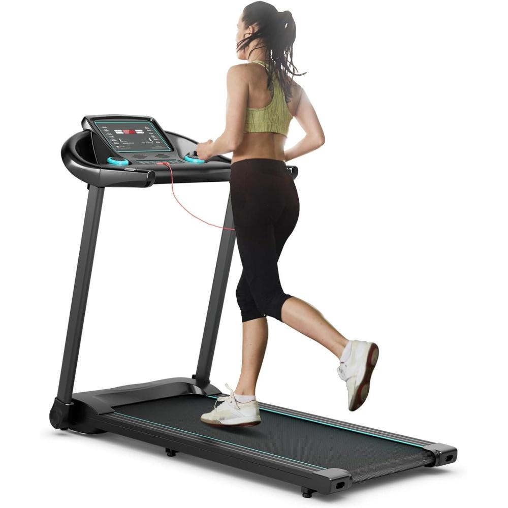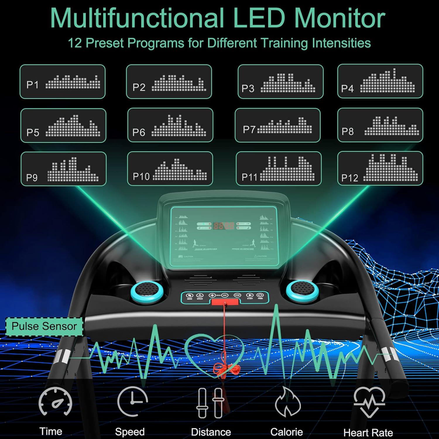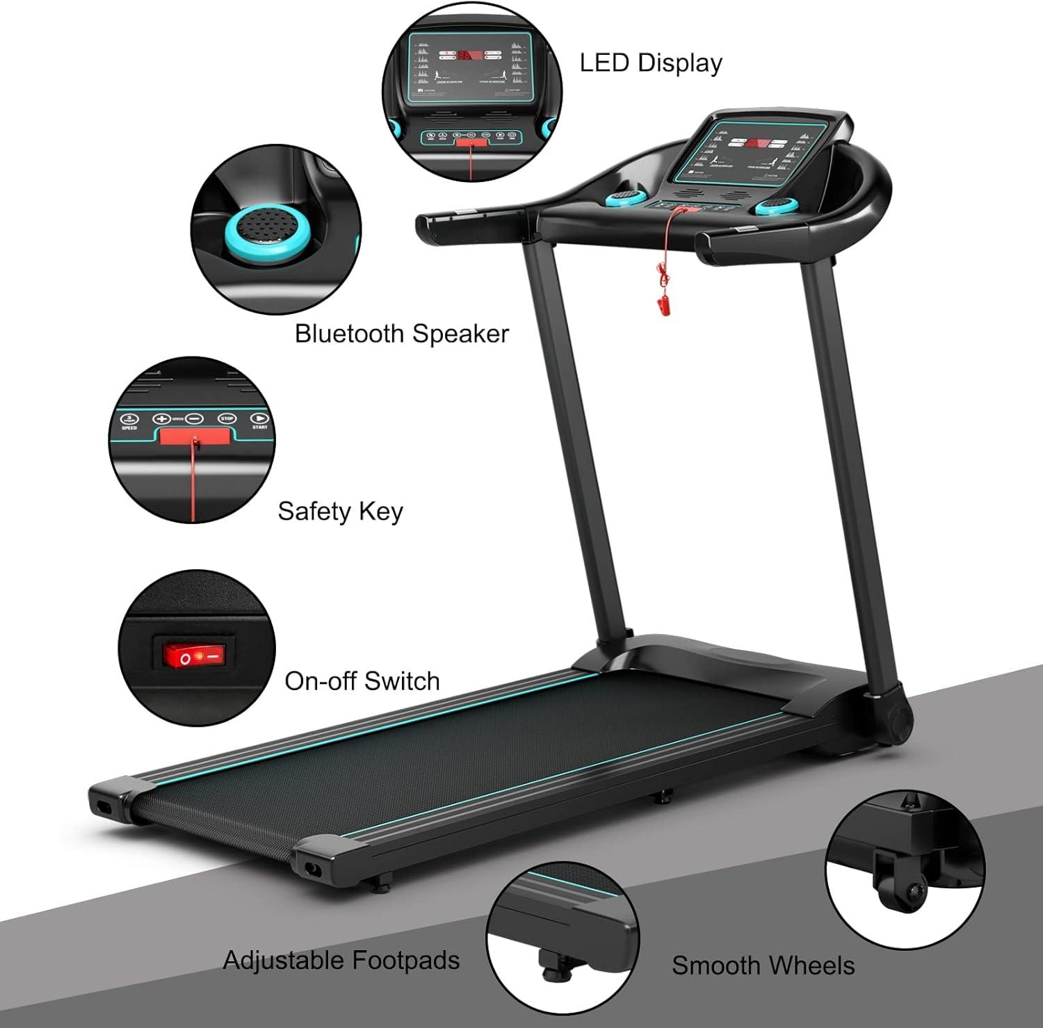 imageGoplus 225HP Folding Treadmill Portable Electric Superfit Treadmill WAPP Control 12 Preset Programs Blue Tooth Speaker LED Display Walking Running Machine for Home OfficeBlue
