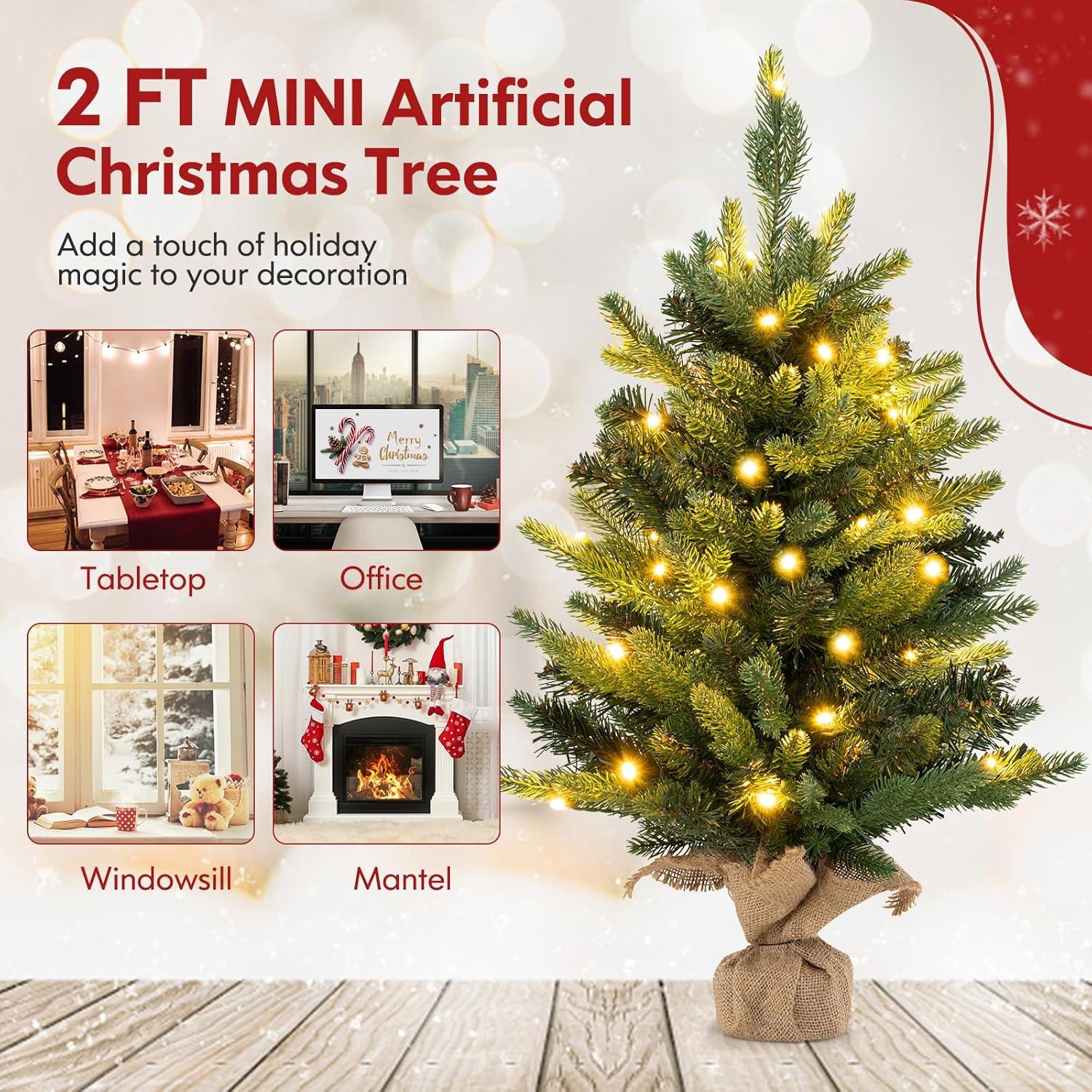 Goplus 2ft Pre-Lit Tabletop Christmas Tree, Small Artificial Fir Tree with 35 Warm White LED Lights, 234 PVC & PE Branch Tips, Burlap Base, Battery Operated Mini Xmas Tree for Home Office Decoration(2ft with Lights)