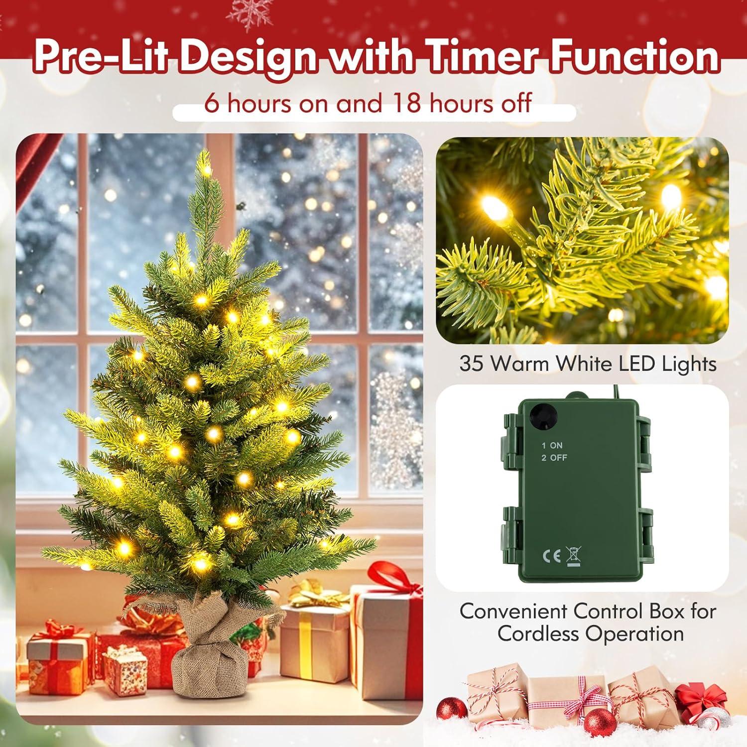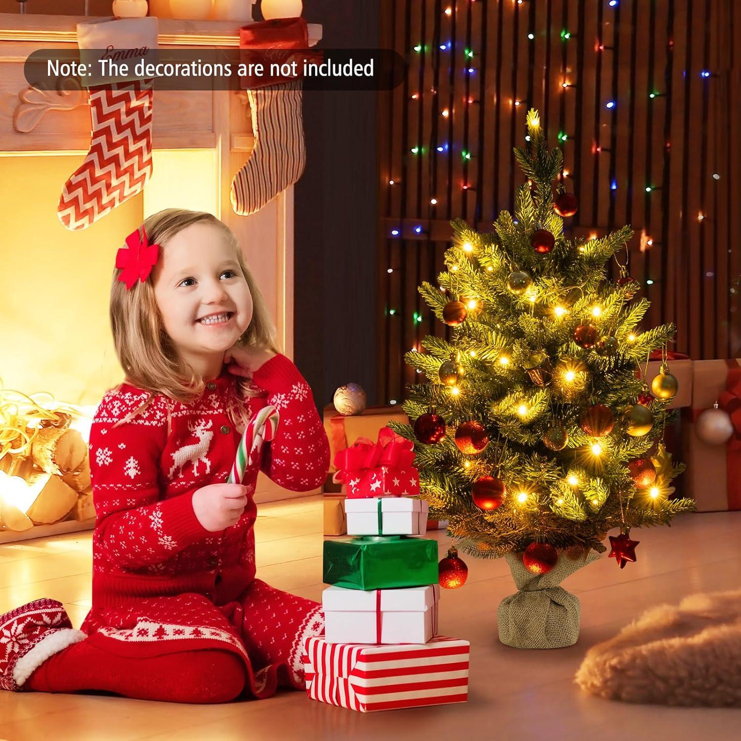 Goplus 2ft Pre-Lit Tabletop Christmas Tree, Small Artificial Fir Tree with 35 Warm White LED Lights, 234 PVC & PE Branch Tips, Burlap Base, Battery Operated Mini Xmas Tree for Home Office Decoration(3ft)