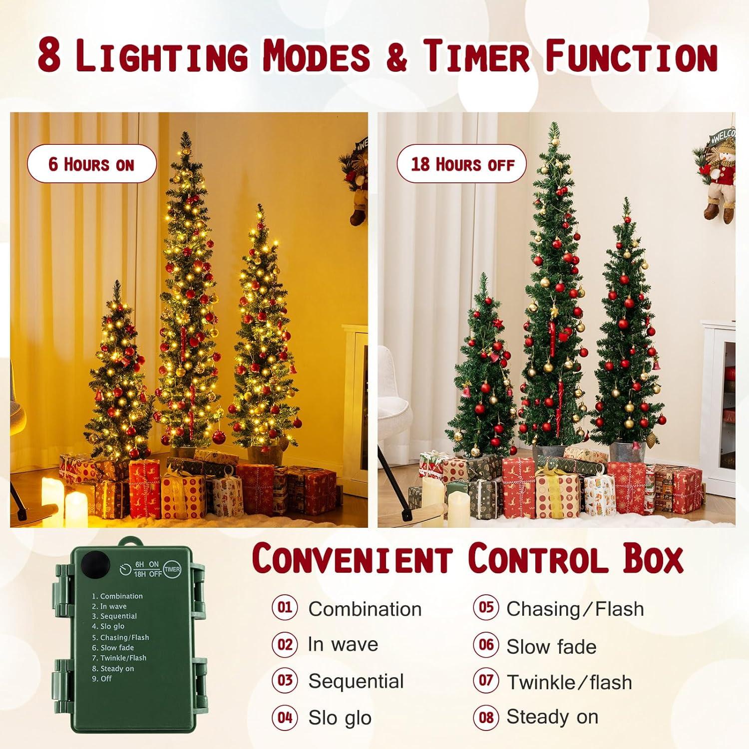 Set of 3 Lighted Christmas Trees: These artificial Xmas trees include 3 different heights – 3 ft, 4 ft, and 5 ft, perfect for creating a layered festive display or decorating separate rooms. Each tree is equipped with its own adapter, allowing for independent lighting and flexible placement throughout your home.