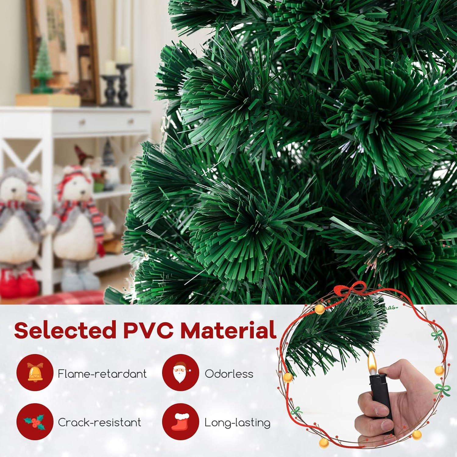 Our 3 ft/95 cm cute Christmas tree is pre-decorated with 93 vibrant branch tips and a radiant star topper, enhancing the visual appeal and festive glow. Moreover, it arrives ready to dazzle with its built-in, slow-flashing multicolored optical fibers that create a mesmerizing and colorful display. Constructed from premium PVC materials, the tree resists fading, remains flame-retardant, and stays fresh and smell-free throughout the season. Its sturdy crossed metal base ensures reliable stability, while the compact 3 ft/95 cm height makes it an ideal addition for apartments, offices, dorms, or entryways. Elevate your holiday decoration instantly and enjoy effortless setup(step 1: unfold the base, step 2: connect the tree to the base, step 3: fluff leaves for a great shape) with this showstopping, space-saving Christmas tree.