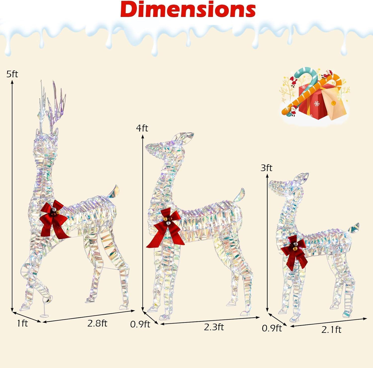 Lively Reindeer Family: Celebrate the season with our hopping reindeer family, featuring a 3.5 ft buck, a 3.1 ft doe, and a 1.6 ft fawn. Each deer is adorned with a festive red bow and shiny balls, bringing a jolly holiday spirit wherever they graced.