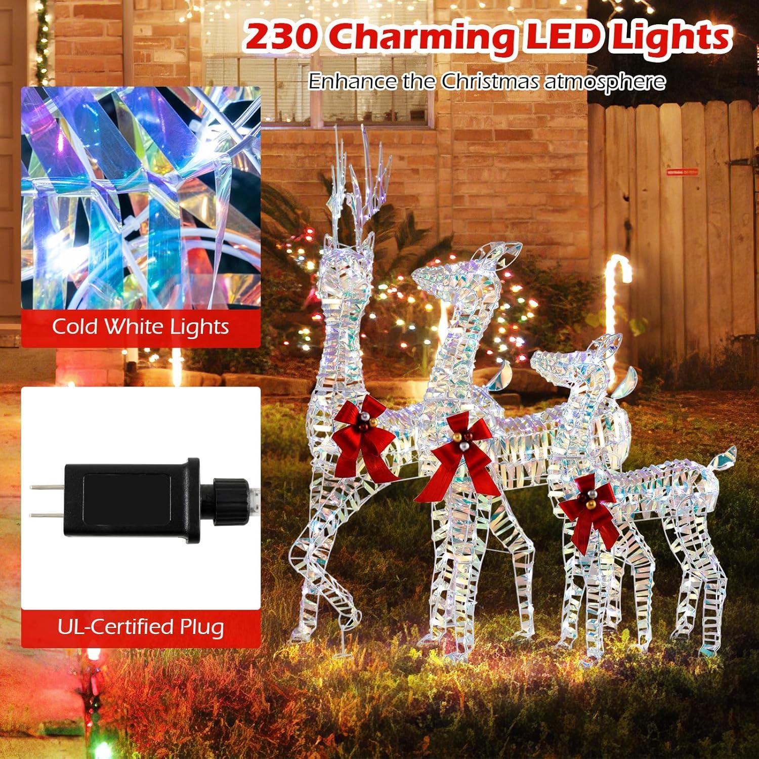 Stunning Light Display: With their shiny prismatic materials and a total of 230 bright LED lights, the lighted reindeer family cast a dynamic glow that captures the magic of Christmas, making your display a neighborhood highlight.