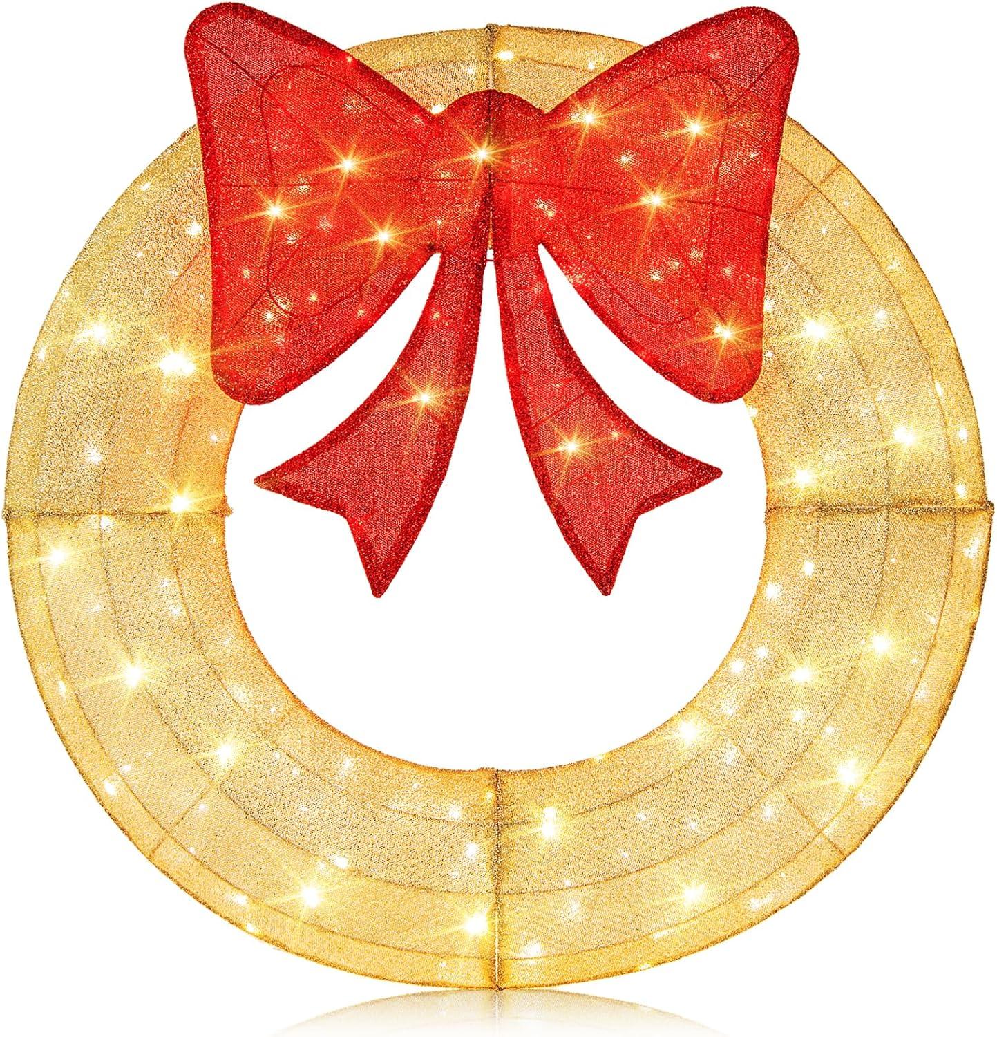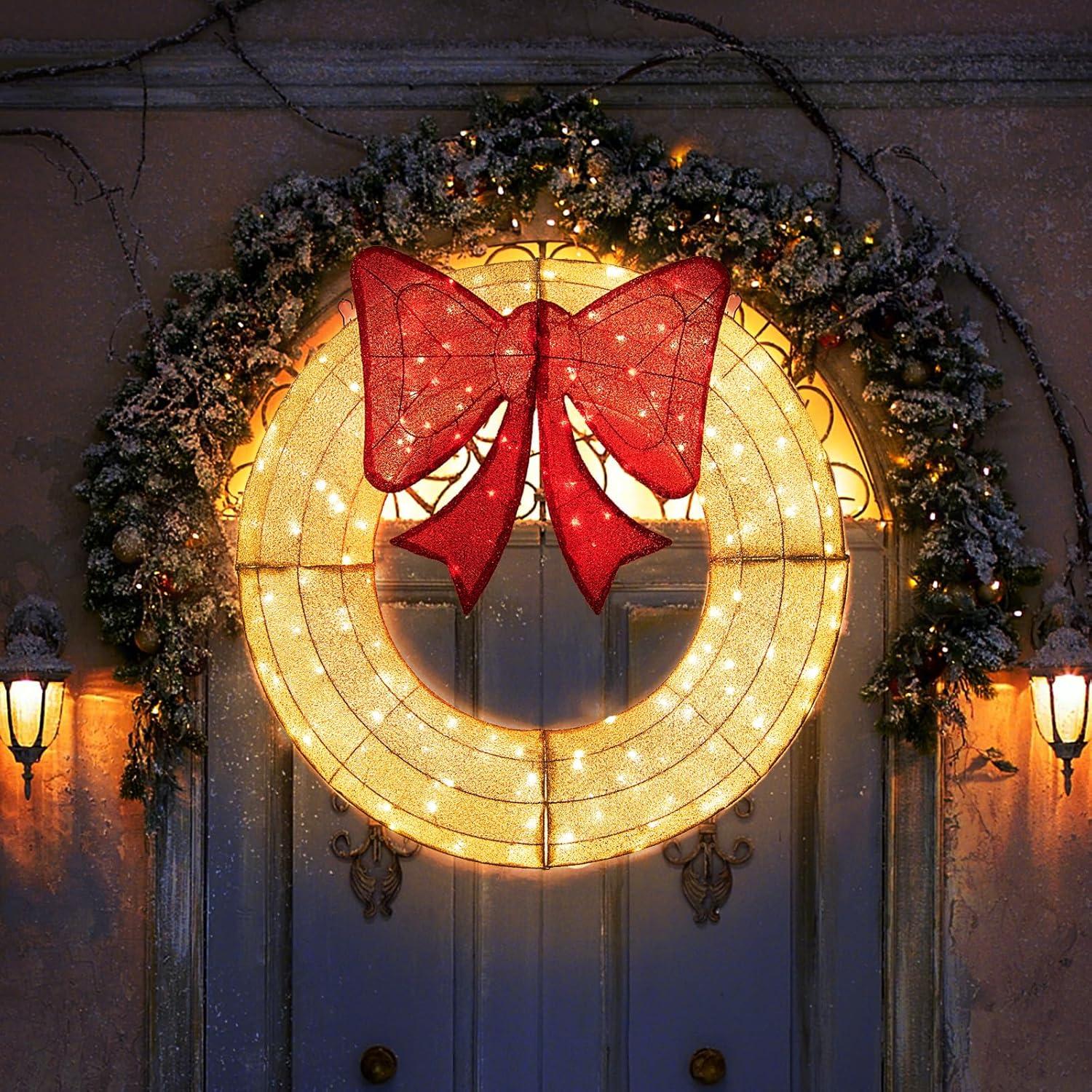 imageGoplus 48 Inch PreLit Christmas Wreath IndoorOutdoor Xmas Decoration with 200 LED Lights Red Bow Hanging Hooks Lighted Christmas Wreath for Garden Yard Living Room GreenGolden