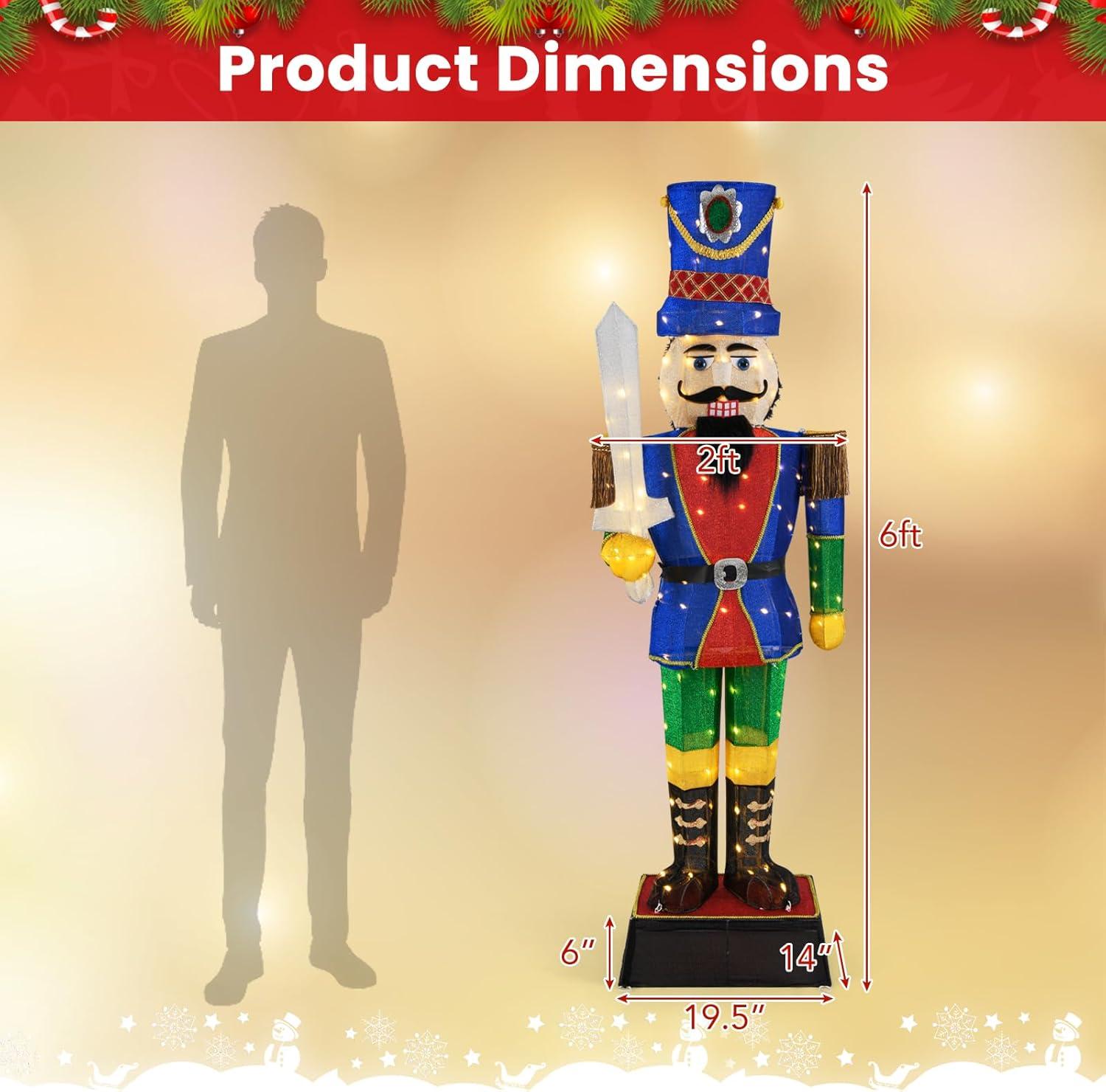 Illuminate Your Holidays – This 6 ft lighted nutcracker is equipped with 110 bright LED lights that illuminate your space with an inviting glow. The lights make the soldier decoration bring the essence of Christmas to your space.