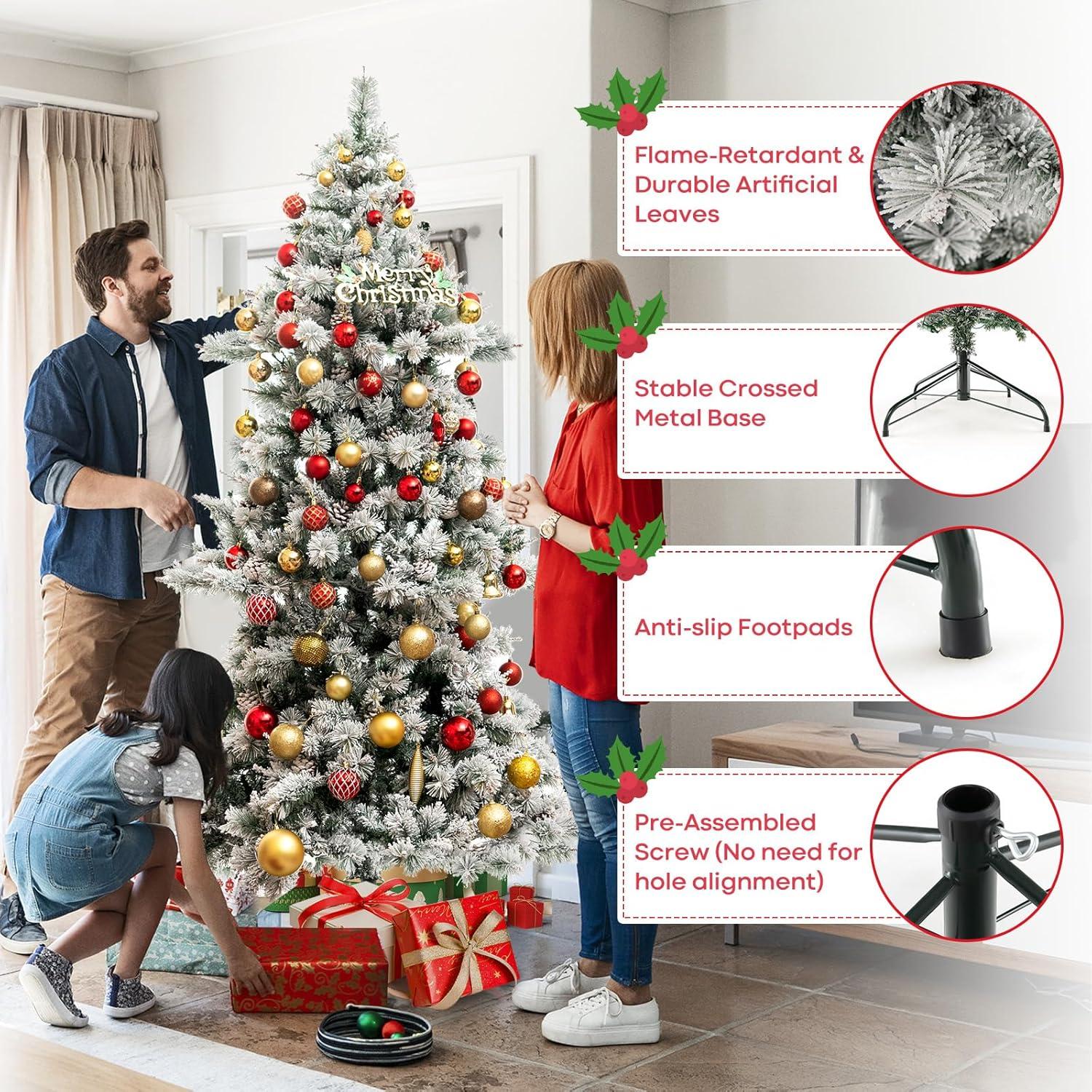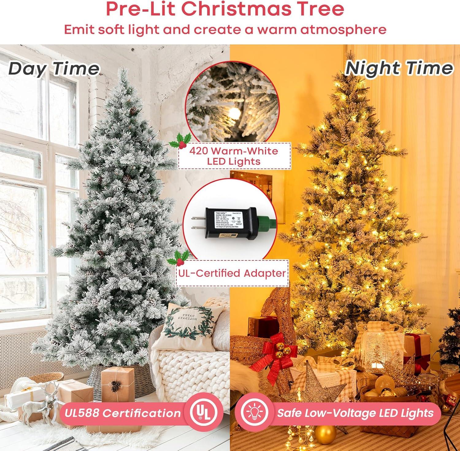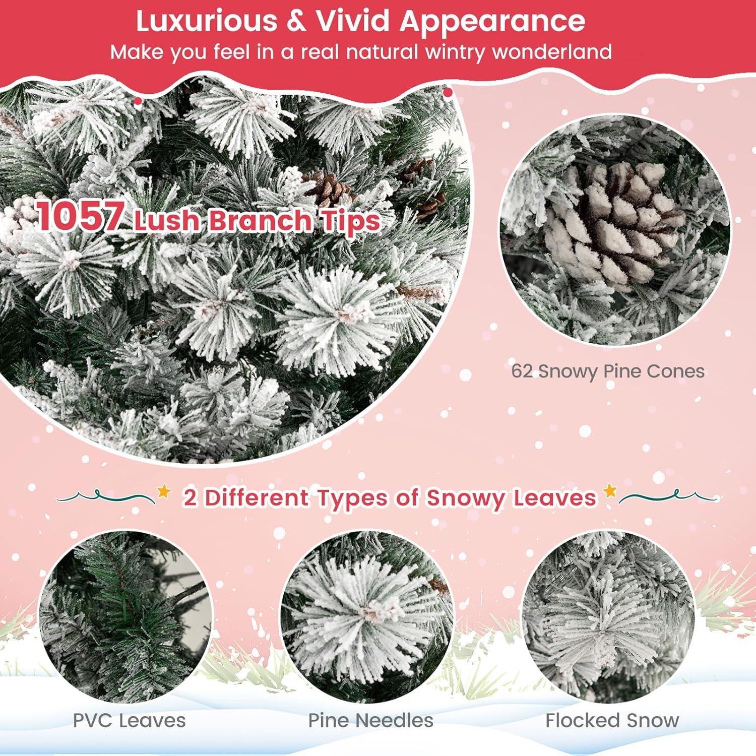 Our 6 ft pre-lit artificial Christmas tree in elegant chocolate tones offers a unique and refined twist on holiday decorating. With 493 lifelike branch tips spread across layered branches, it delivers impressive fullness and depth from every angle. Carefully arranged pine needles and PVC leaves, complemented by natural pine cones and warm white LED lights, give this tree a luxurious, festive glow that transforms any space into a holiday haven. Pre-lit design provides flexible options for daytime and nighttime occasions. Built from high-quality, flame-retardant PVC and supported by a sturdy crossed metal base, it ensures both safety and long-lasting structure. Assembly is made remarkably simple with flexible hinged branches and a pre-assembled base screw – no struggling to align holes. Designed in 3 sections, it fits easily into storage after the season. Whether you’re looking to decorate a living room, office, store, or event venue, this remarkable tree is the perfect centerpiece, bringing elegance and warmth to all your winter celebrations. Note: The decorations are not included