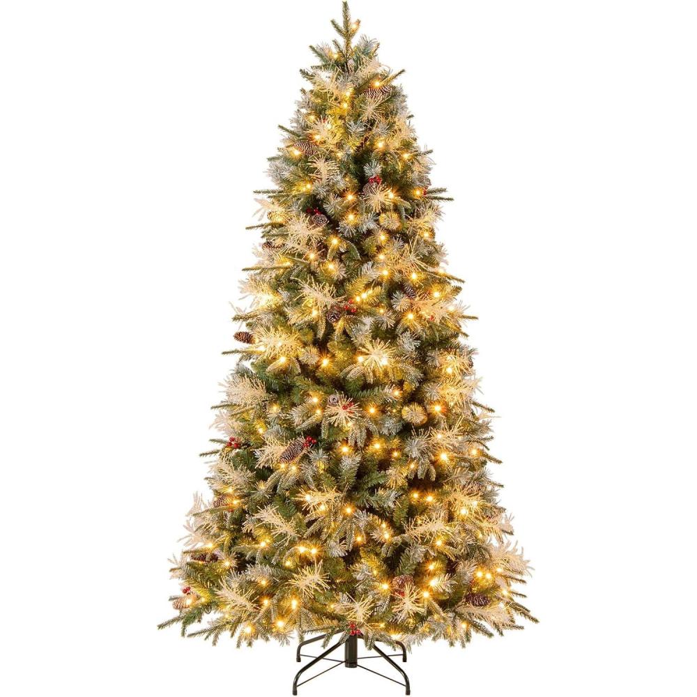 imageGoplus 6 FT PreLit Artificial Christmas Tree Hinged Xmas Tree with 270 Warm White LED Lights 8 Modes 806 Branch Tips Pine Cones Berries Metal Stand Home Office Holiday DecorationFull Tree7ft
