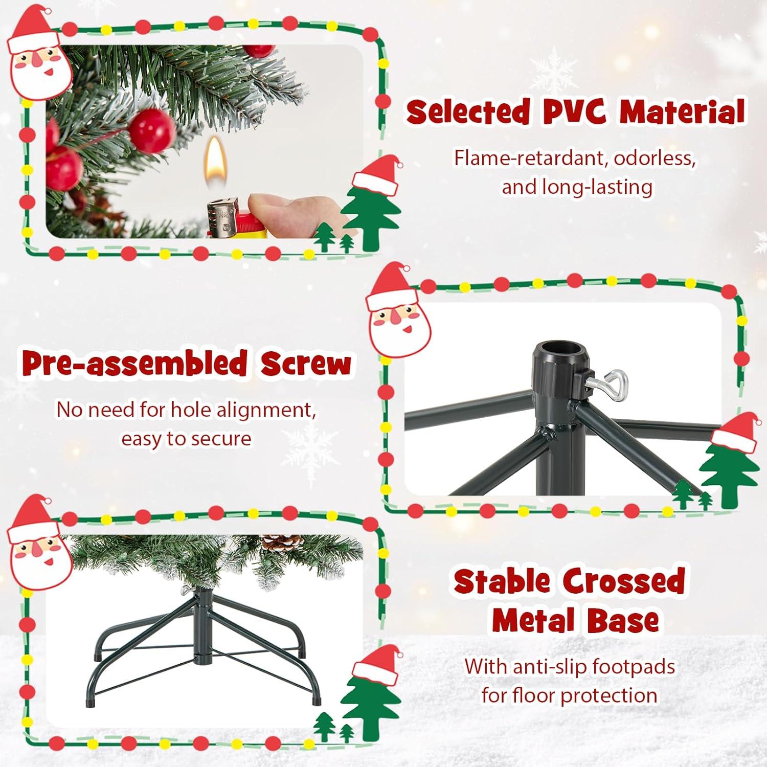 Goplus 6 FT Pre-Lit Artificial Christmas Tree, Hinged Xmas Tree with 270 Warm White LED Lights, 8 Modes, 806 Branch Tips, Pine Cones, Berries, Metal Stand, Home Office Holiday Decoration(Full Tree-5ft)