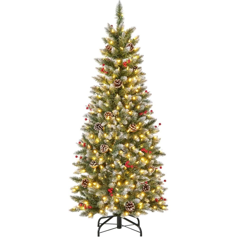 imageGoplus 6 FT PreLit Artificial Christmas Tree Hinged Xmas Tree with 270 Warm White LED Lights 8 Modes 806 Branch Tips Pine Cones Berries Metal Stand Home Office Holiday DecorationPencil Tree5ft