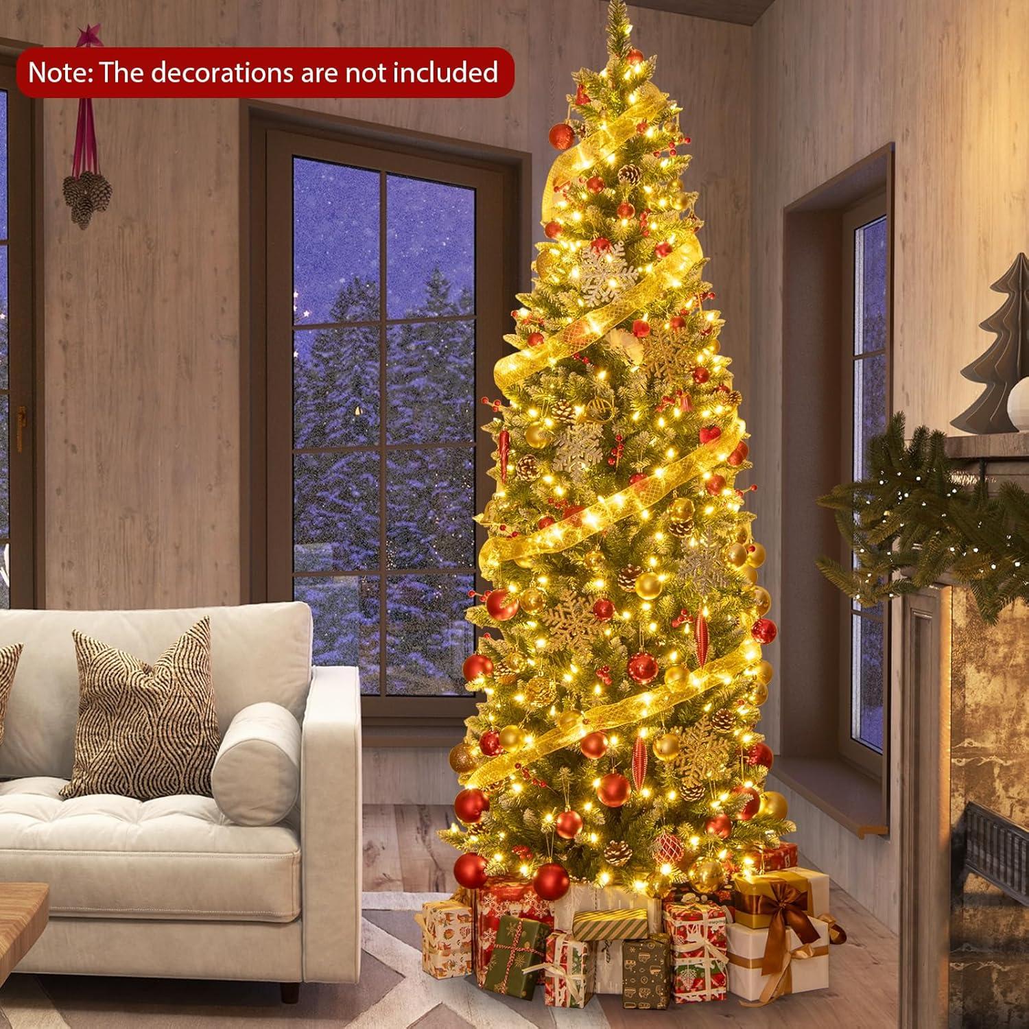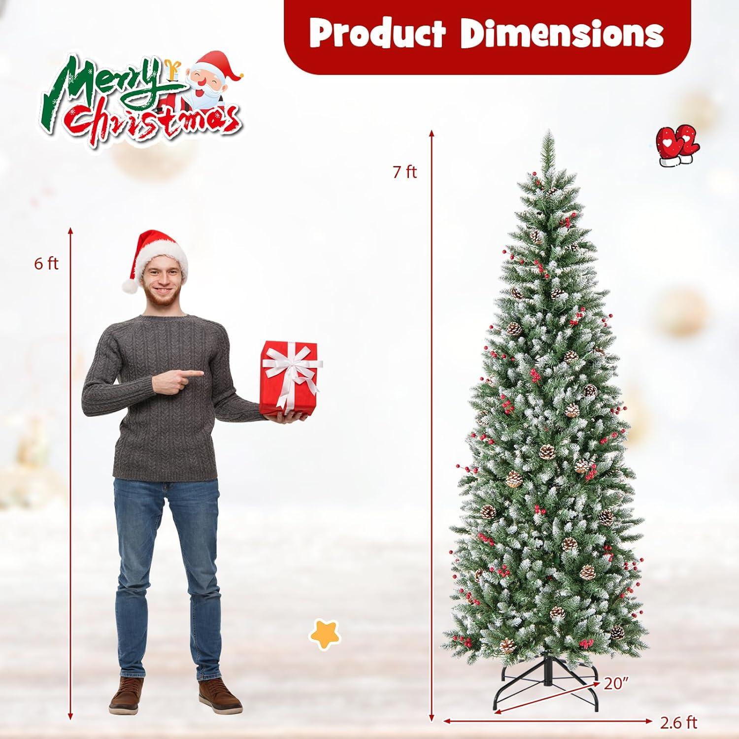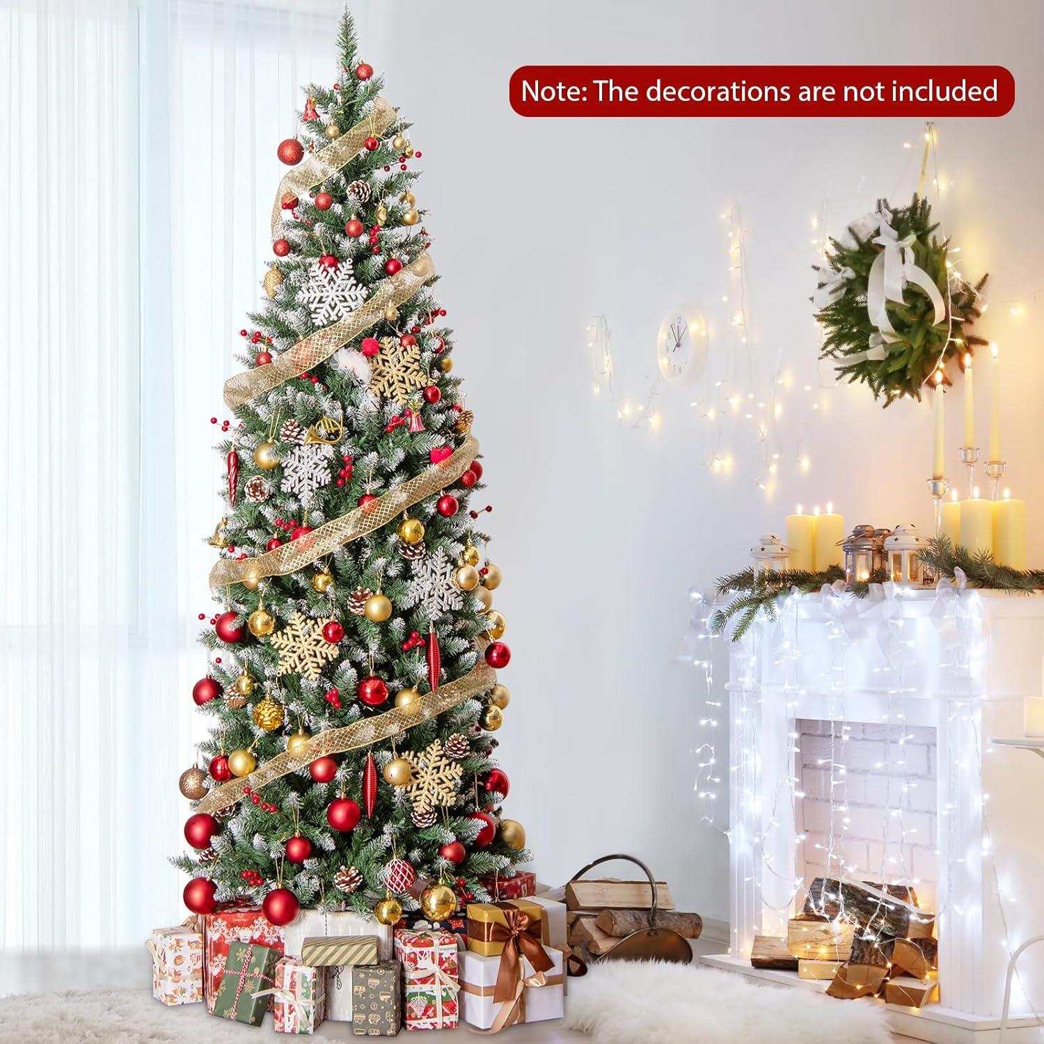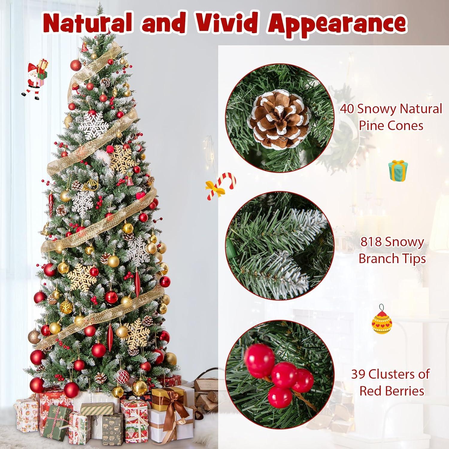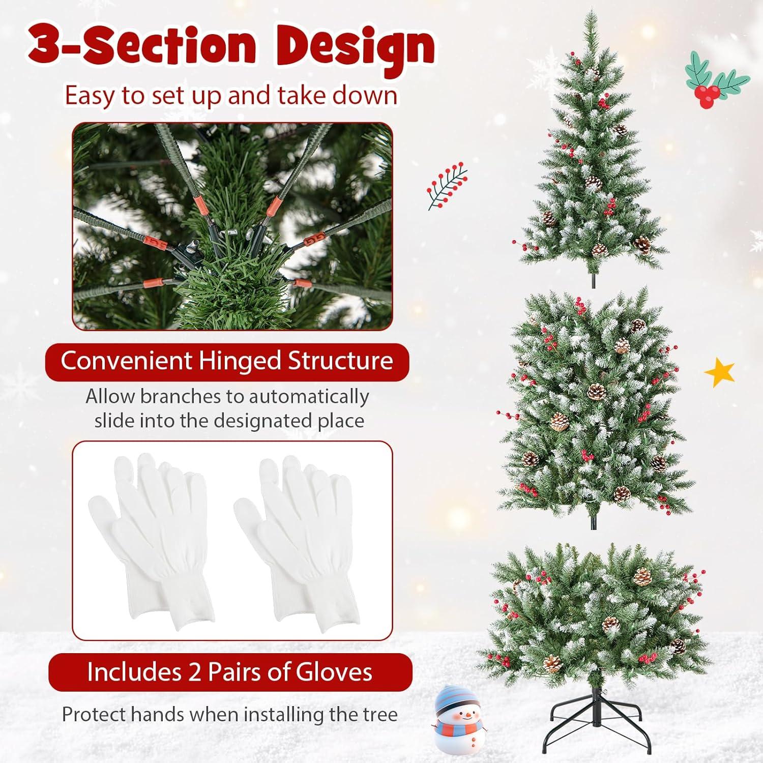 Our 5/6/7 ft pre-lit artificial Christmas tree elevates any space with its rich blend of foliage that mimics a real tree – coarse PET needles and both snow-sprayed PE and PVC leaves, all crafted from new, fire-resistant, and non-allergic materials. Pre-decorated with 26/32/40 natural pine cones and 26/32/40 clusters of vivid red berries, the tree also features 190/270/350 warm white LED lights, paired with 8 modes (Combination, in wave, sequential, slo-glo, chasing, flash, slow fade, twinkle, flash, steady on), providing endless possibilities for a lively and visually captivating holiday display. Assembly is a breeze thanks to the flexible hinge design that allows branches to effortlessly fall into place and the 2/3/3-section structure, paired with a sturdy crossed metal base equipped with a pre-assembled screw, no need for hole alignment, easy to secure. Reliable construction ensures the tree remains stable and upright throughout the season. This tree requires minimal additional decoration, saving you both time and effort in creating a memorable holiday atmosphere!