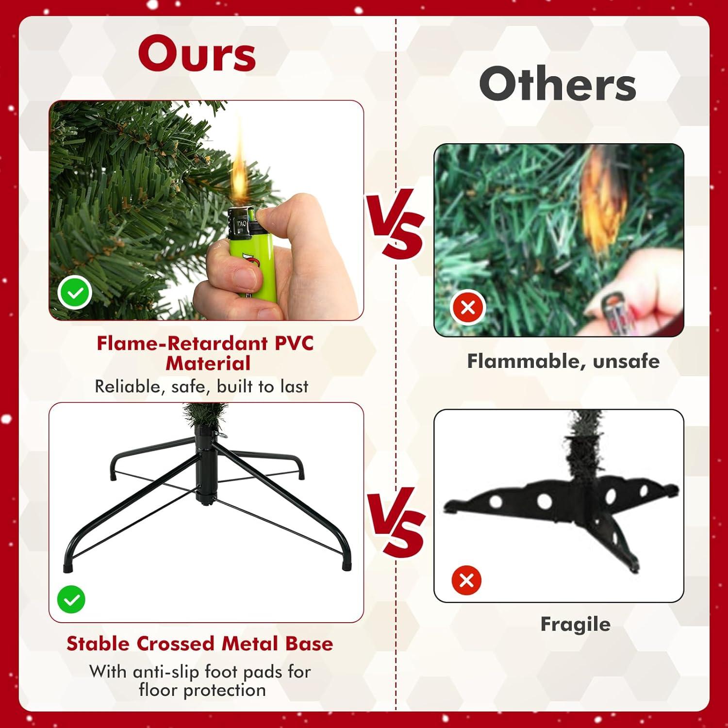 Flame-Retardant Leaves & Stable Base: The leaves are crafted of flame-retardant PVC material, ensuring safety and reliability during the festival season. Plus, the tree stands securely on a stable crossed metal base, ensuring your holiday display remains sturdy and upright throughout the season.
