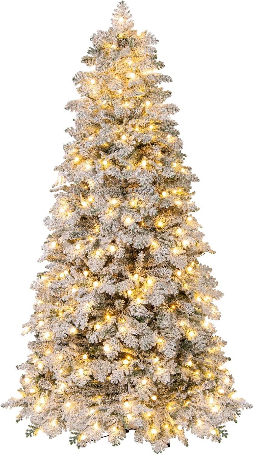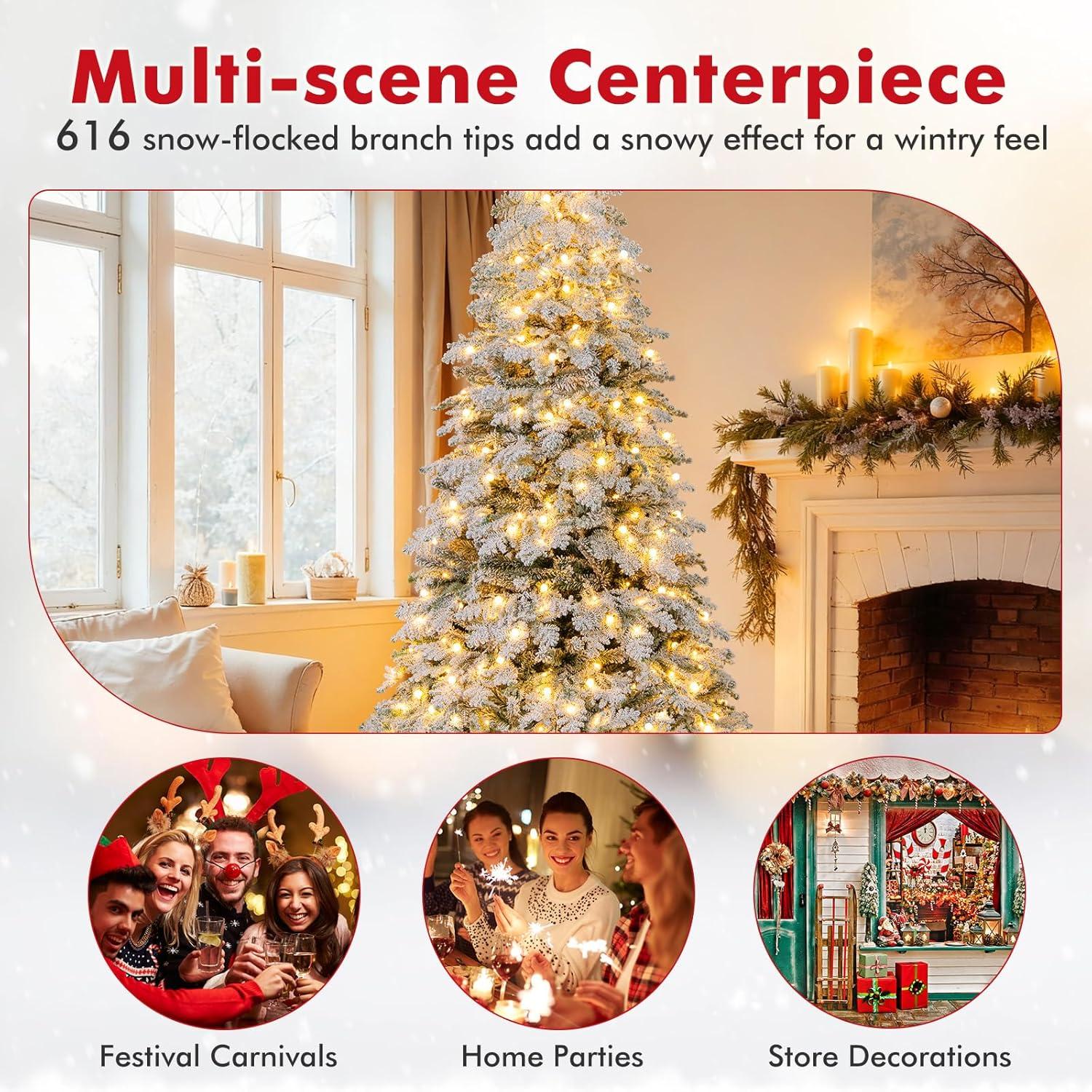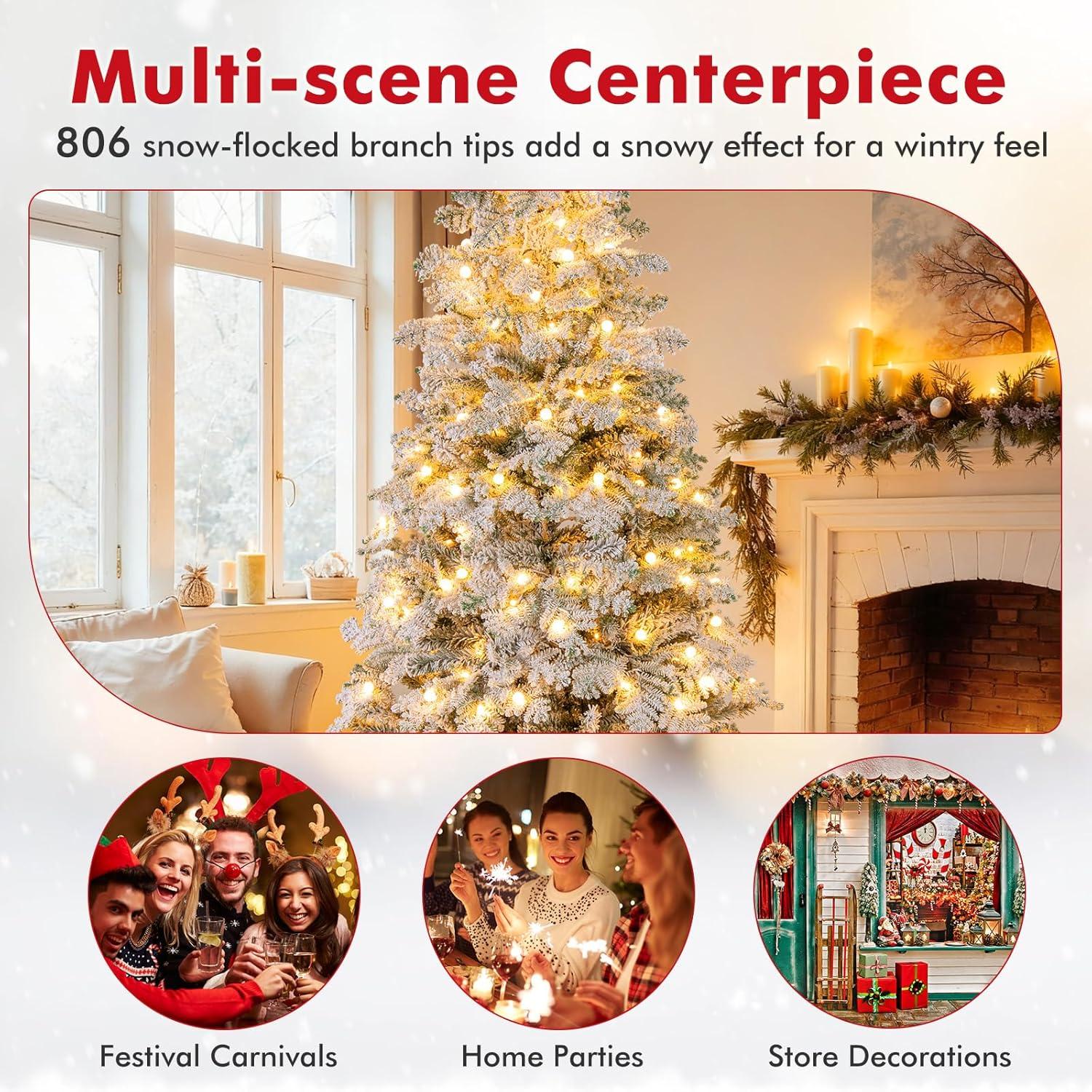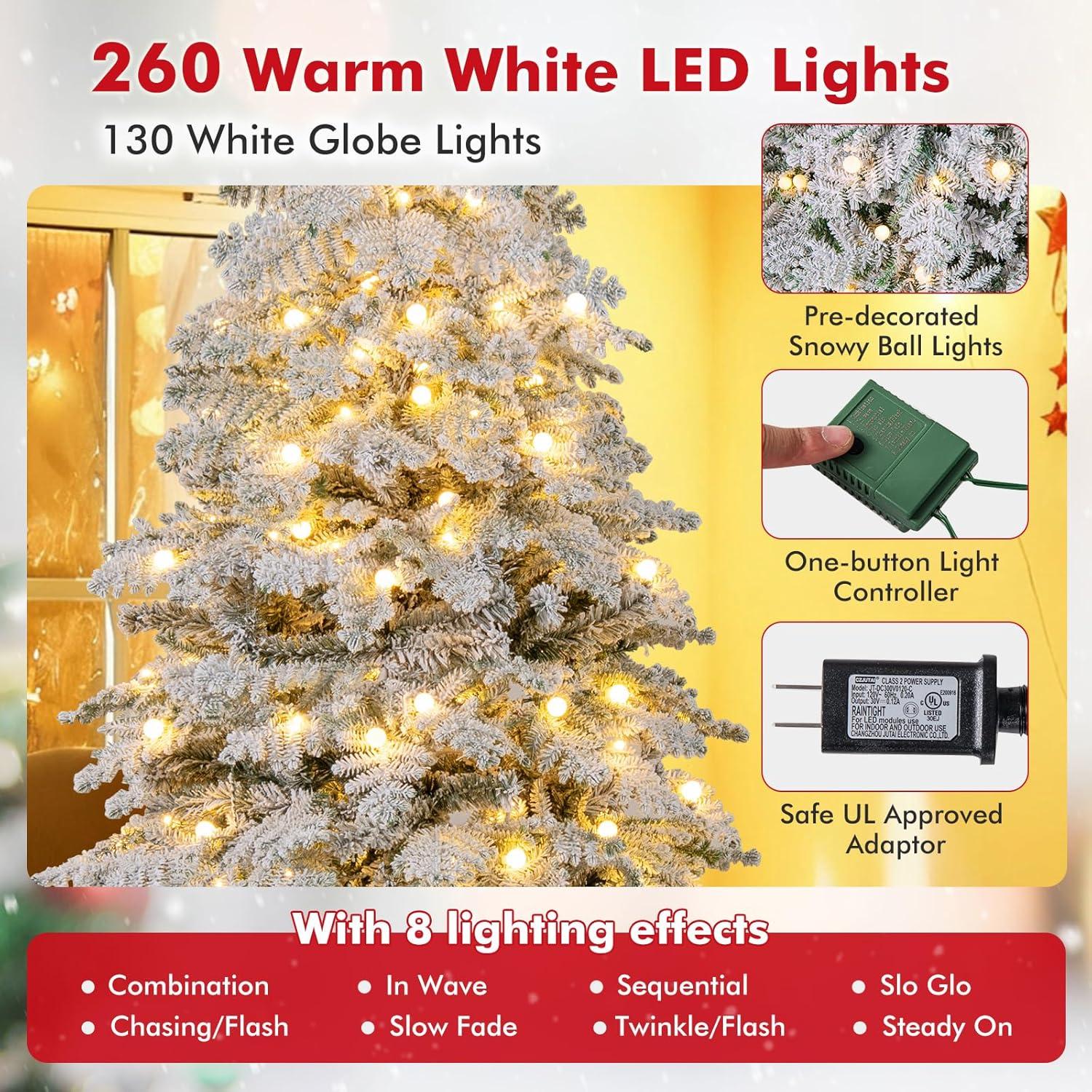 Our 6/7 ft pre-lit and pre-decorated Christmas tree transforms your holiday decoration with 616/806 snow-flocked branch tips and a beautiful layered spruce design. Carefully crafted to deliver lifelike texture and color variation, it features both premium PVC and PE needles for a realistic look that endures year after year. With 260/320 warm white LED lights and 130/160 globe lights pre-strung, you can instantly brighten up any room and enjoy 8 unique lighting modes (combination, in wave, sequential, slo glo, chasing/flash, slow fade, twinkle/flash, steady on) to match your festive mood. Thoughtfully designed for hassle-free assembly, the tree breaks down into 3 simple sections, while flexible hinged branches and a foldable crossed metal base ensure reliable support and easy storage between seasons. Ideal for homes, offices, retail displays, or special event settings, this Christmas tree brings timeless holiday charm and versatility to any celebration.