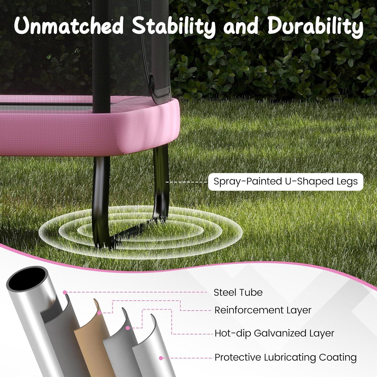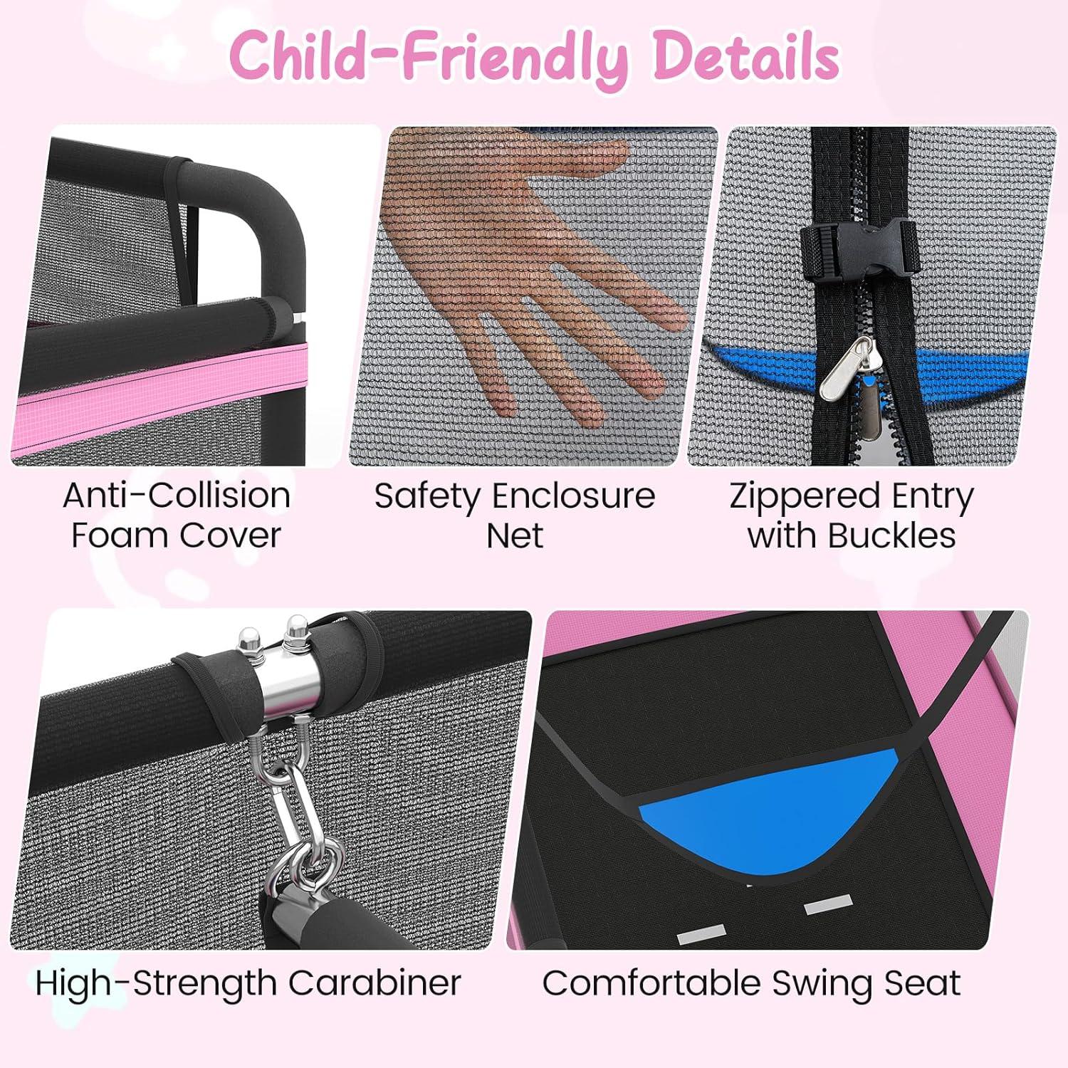 Equipped with a detachable swing and horizontal bar, the backyard trampoline enriches playtime by offering various activities that enhance motor skills. Its elastic PP jumping mat and 32 high-tensile springs ensure dynamic bounce quality. The no-gap design, combined with a padded spring cover, enhances safety, while the hot-dip galvanized frame and spray-painted U-shaped legs contribute to solid stability and lasting durability. To further prioritize children’s safety, the outdoor indoor trampoline features an anti-collision foam cover and secure enclosure net with a zippered entry. Suitable for both outdoor and indoor settings,this rebounder trampoline promises to keep your children active, entertained, and safe.