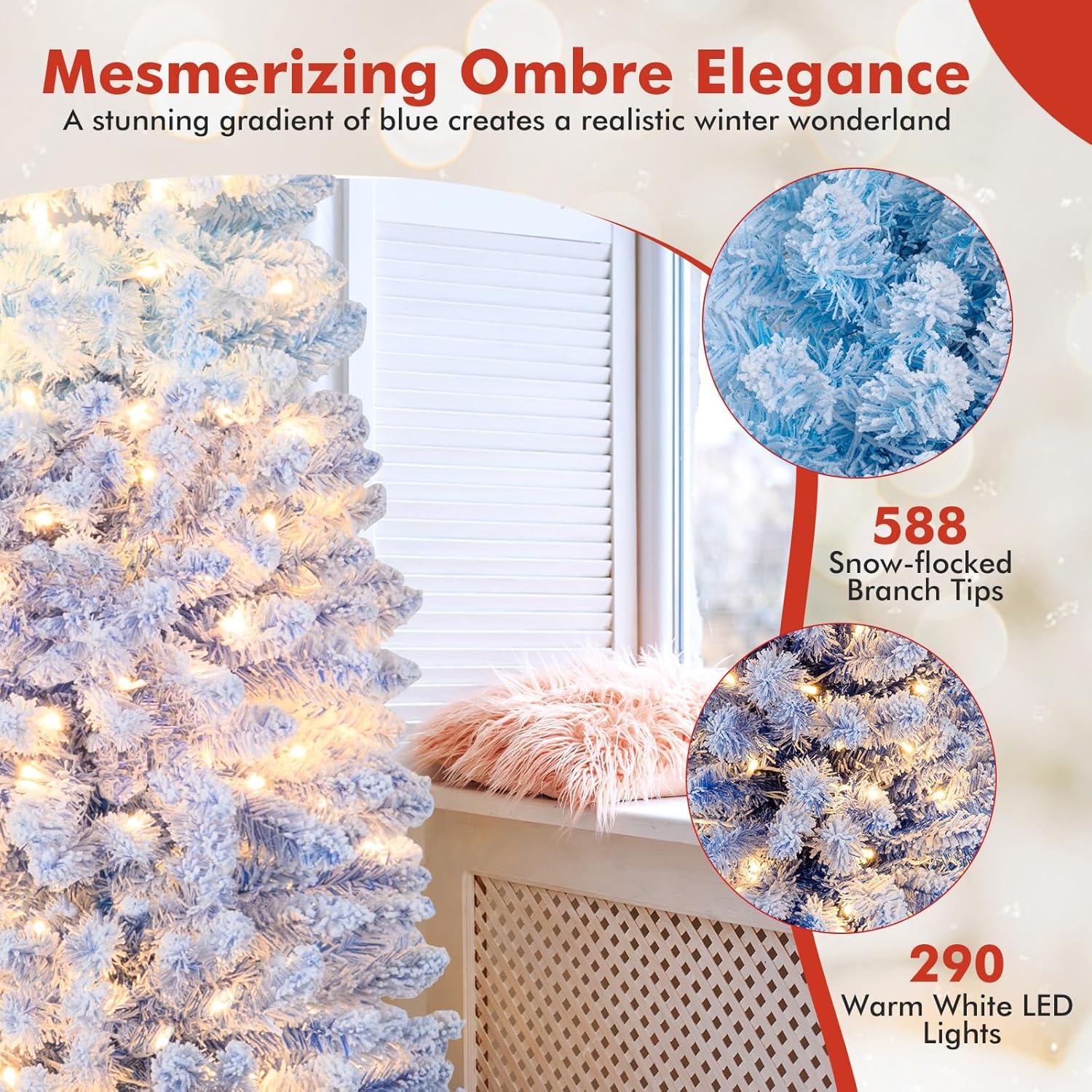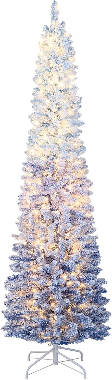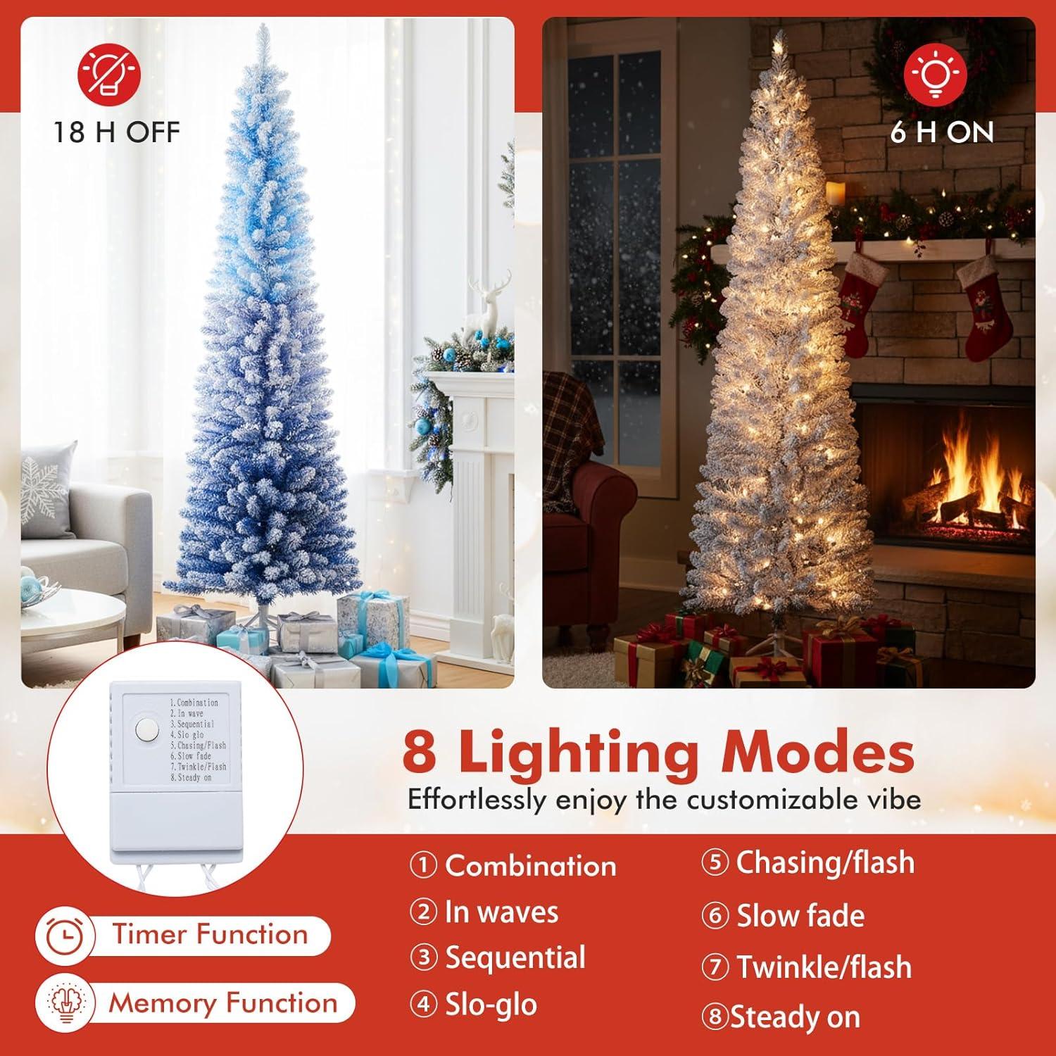 Our 6/7 ft pre-lit artificial Christmas tree is designed in a captivating pink gradient and beautifully flocked with thick white snow for a refreshing, modern look. The slim pencil silhouette offers 392/527 full branch tips, creating a lush appearance that stands out stylishly, whether placed in a cozy corner or as the room’s centerpiece. Illuminated by 140/180 warm white LED lights and featuring 8 versatile lighting modes (combination, in wave, sequential, slo glo, chasing/flash, slow fade, twinkle/flash, steady on), the tree lets you customize your ambiance for any celebration. Expertly crafted from 100% new PVC, it boasts fade-resistant and flame-retardant branches, all supported by a sturdy crossed metal base for reliable stability throughout the season. With its 2/3-section structure and a user-friendly pre-assembled screw on the base, installation and storage are both quick and convenient. This pink snow flocked tree brings cheerful charm and a splash of color to Christmas, birthdays, weddings, or special events.