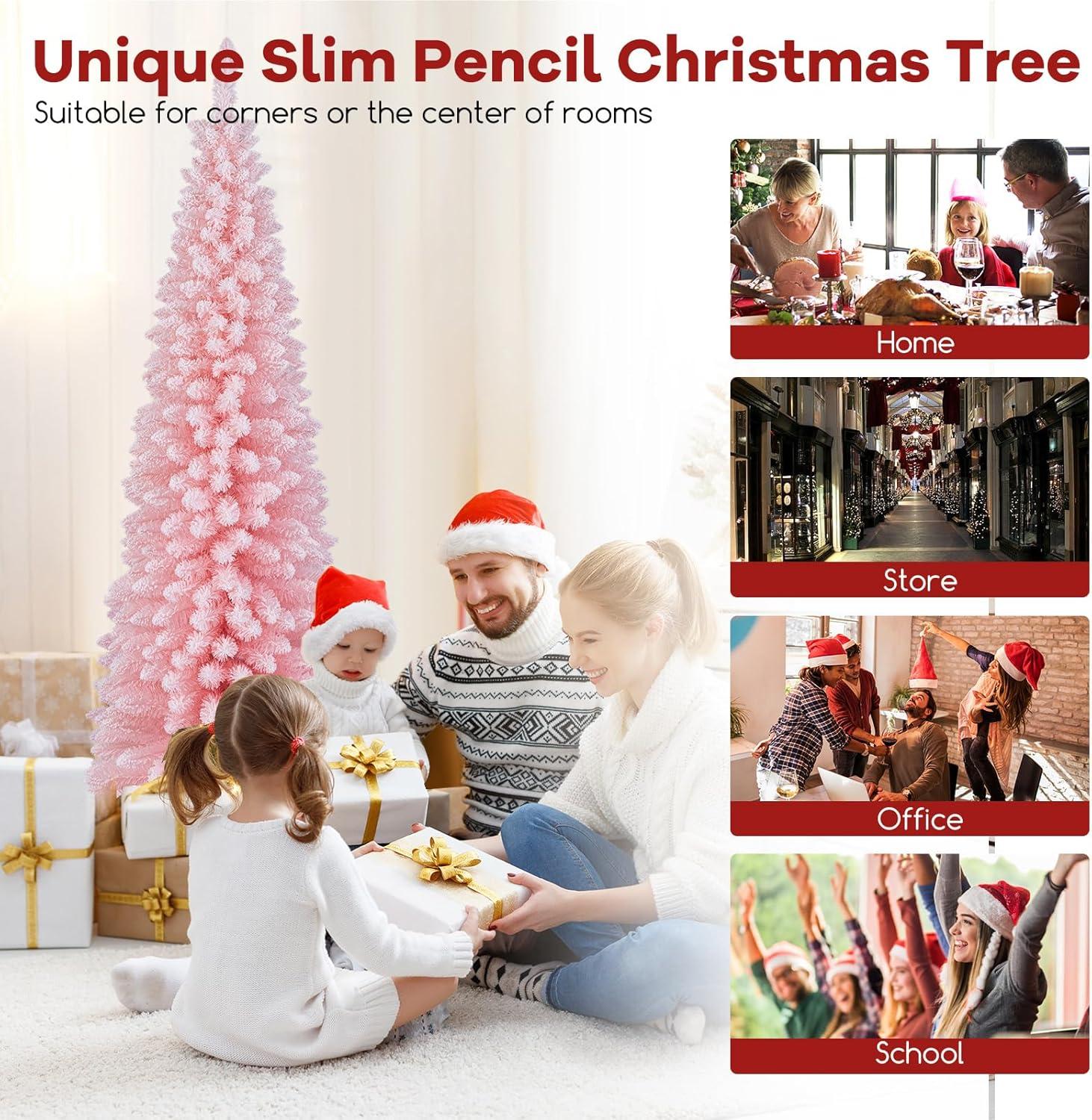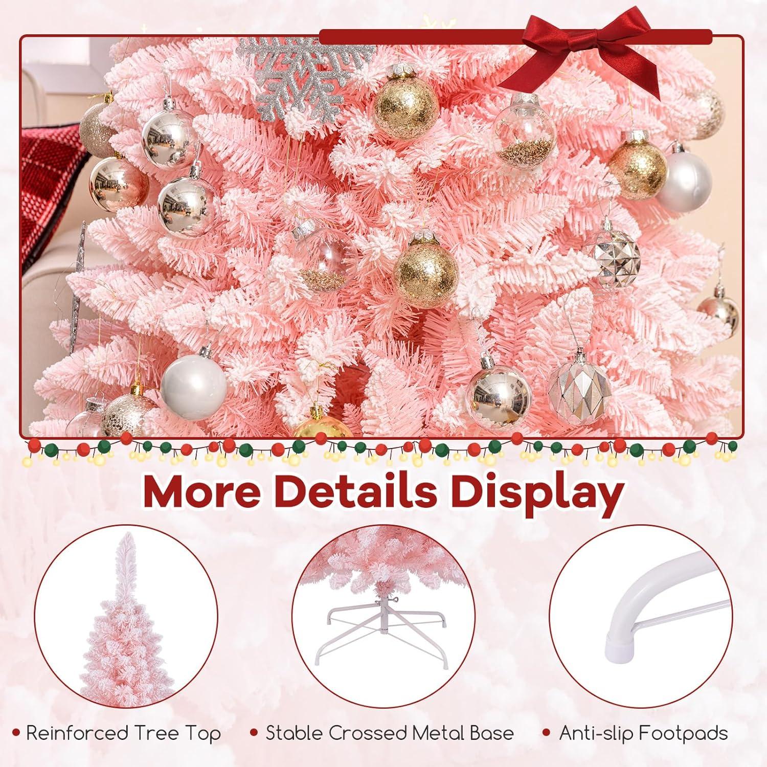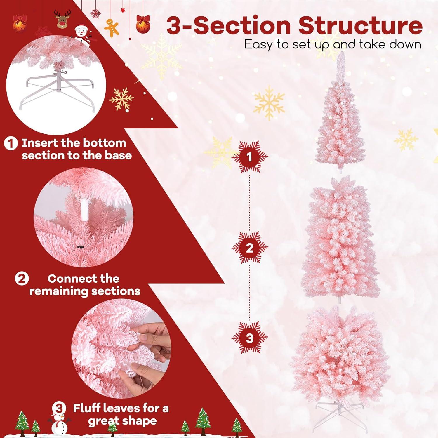 Our 6/7 ft pre-lit artificial Christmas tree is designed in a captivating pink gradient and beautifully flocked with thick white snow for a refreshing, modern look. The slim pencil silhouette offers 392/527 full branch tips, creating a lush appearance that stands out stylishly, whether placed in a cozy corner or as the room’s centerpiece. Illuminated by 140/180 warm white LED lights and featuring 8 versatile lighting modes (combination, in wave, sequential, slo glo, chasing/flash, slow fade, twinkle/flash, steady on), the tree lets you customize your ambiance for any celebration. Expertly crafted from 100% new PVC, it boasts fade-resistant and flame-retardant branches, all supported by a sturdy crossed metal base for reliable stability throughout the season. With its 2/3-section structure and a user-friendly pre-assembled screw on the base, installation and storage are both quick and convenient. This pink snow flocked tree brings cheerful charm and a splash of color to Christmas, birthdays, weddings, or special events.