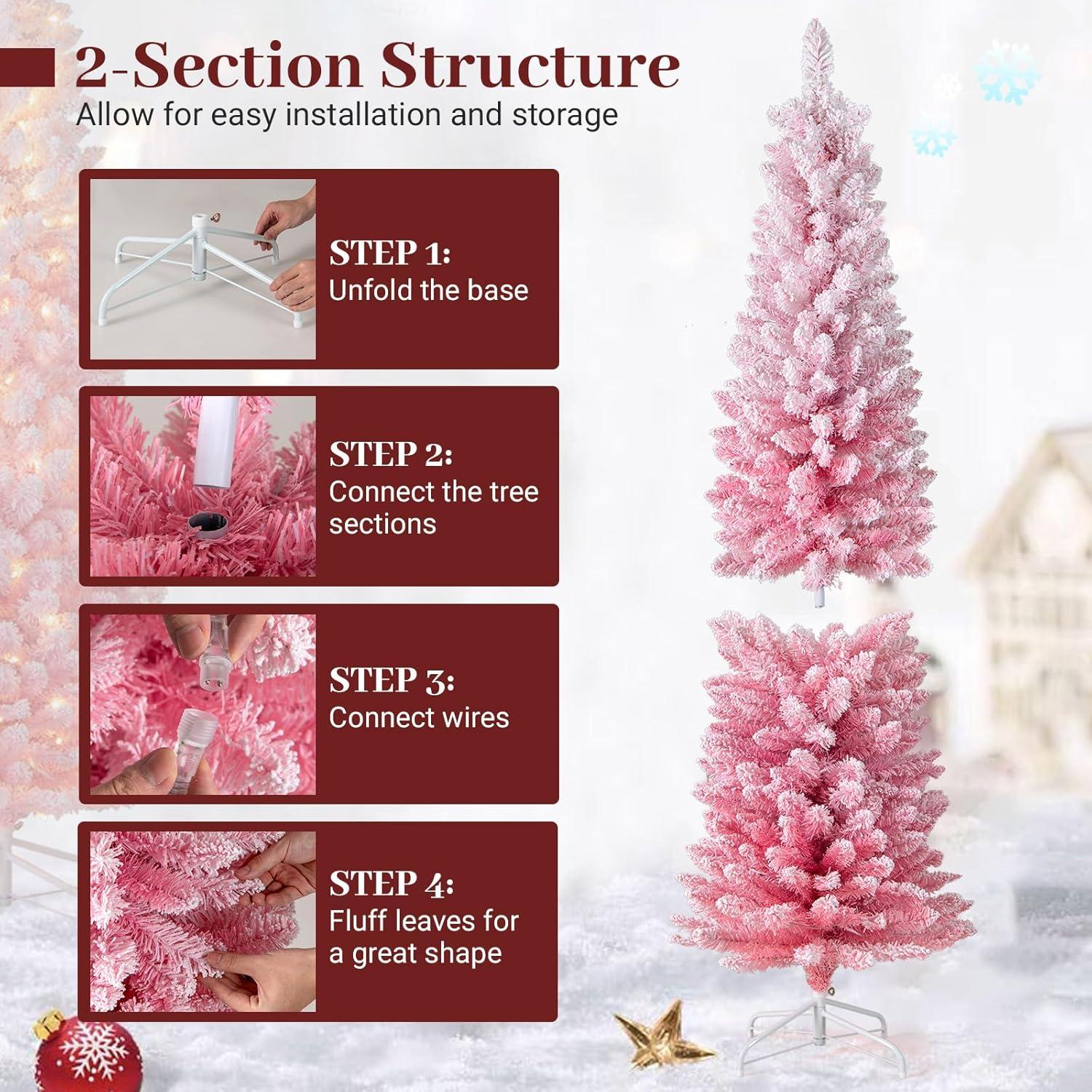 Our 6/7 ft pre-lit artificial Christmas tree is designed in a captivating pink gradient and beautifully flocked with thick white snow for a refreshing, modern look. The slim pencil silhouette offers 392/527 full branch tips, creating a lush appearance that stands out stylishly, whether placed in a cozy corner or as the room’s centerpiece. Illuminated by 140/180 warm white LED lights and featuring 8 versatile lighting modes (combination, in wave, sequential, slo glo, chasing/flash, slow fade, twinkle/flash, steady on), the tree lets you customize your ambiance for any celebration. Expertly crafted from 100% new PVC, it boasts fade-resistant and flame-retardant branches, all supported by a sturdy crossed metal base for reliable stability throughout the season. With its 2/3-section structure and a user-friendly pre-assembled screw on the base, installation and storage are both quick and convenient. This pink snow flocked tree brings cheerful charm and a splash of color to Christmas, birthdays, weddings, or special events.