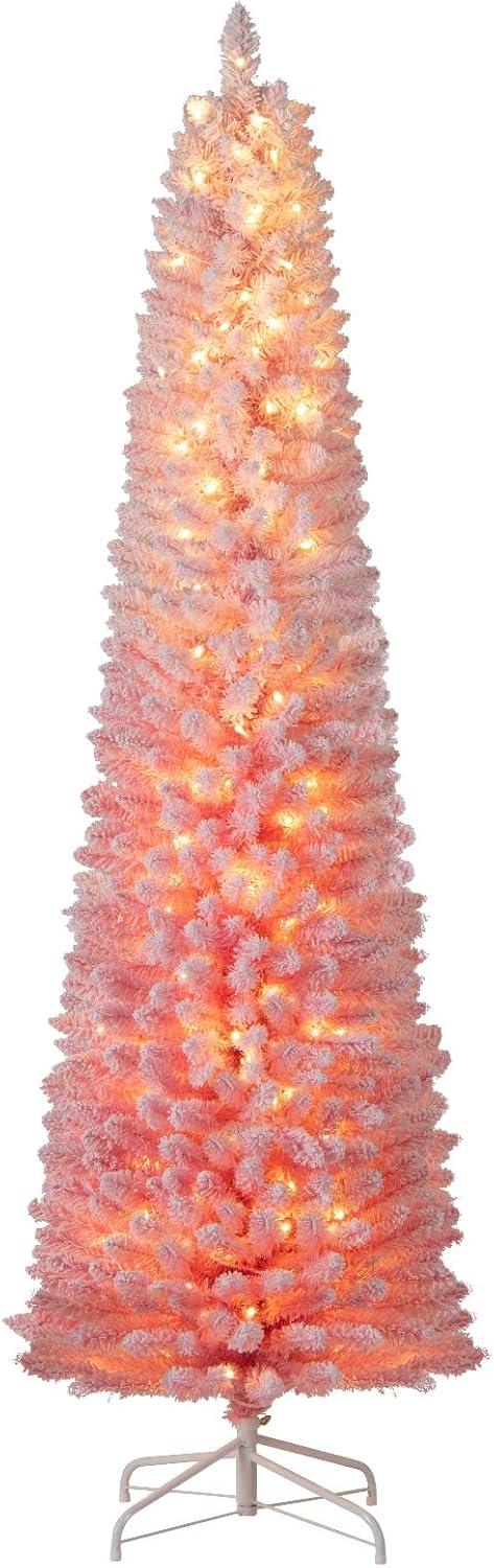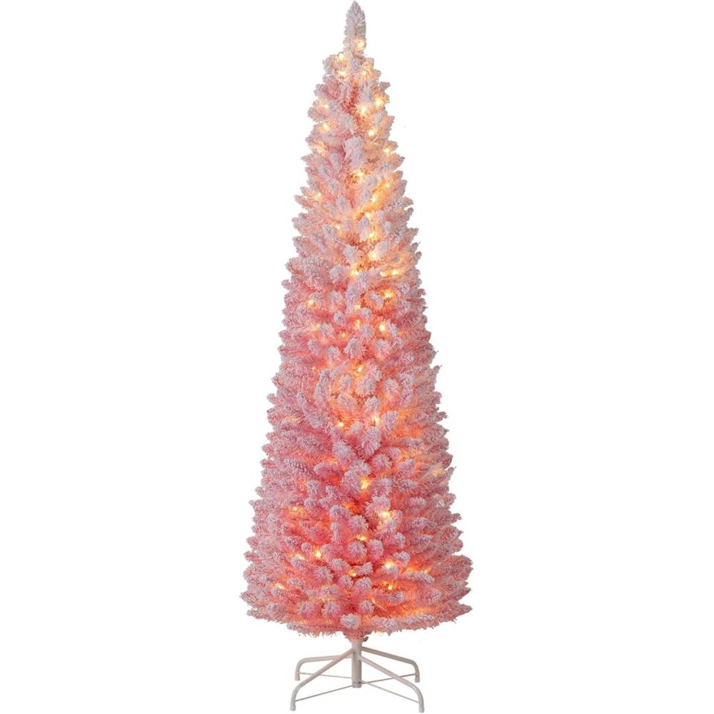 imageGoplus 6ft Pink Slim Pencil Christmas Tree Prelit Snow Flocked Artificial Skinny Xmas Tree with 140 Warm White LED Lights 8 Lighting Modes 392 Branch Tips ampamp Metal Stand Home Office DecorationGradient Blueprelit