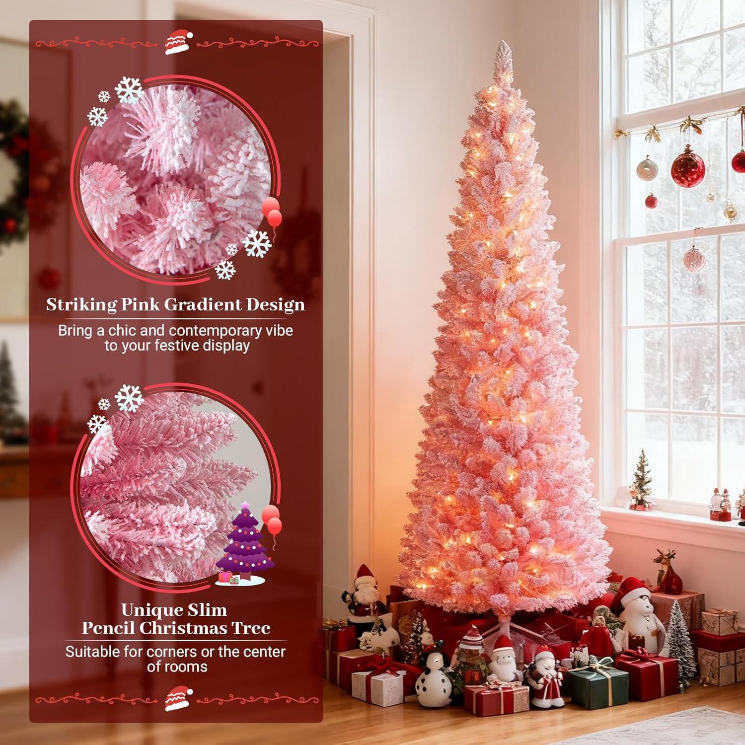 Goplus 6ft Pink Slim Pencil Christmas Tree, Pre-lit Snow Flocked Artificial Skinny Xmas Tree with 140 Warm White LED Lights, 8 Lighting Modes, 392 Branch Tips & Metal Stand, Home Office Decoration(White-prelit)