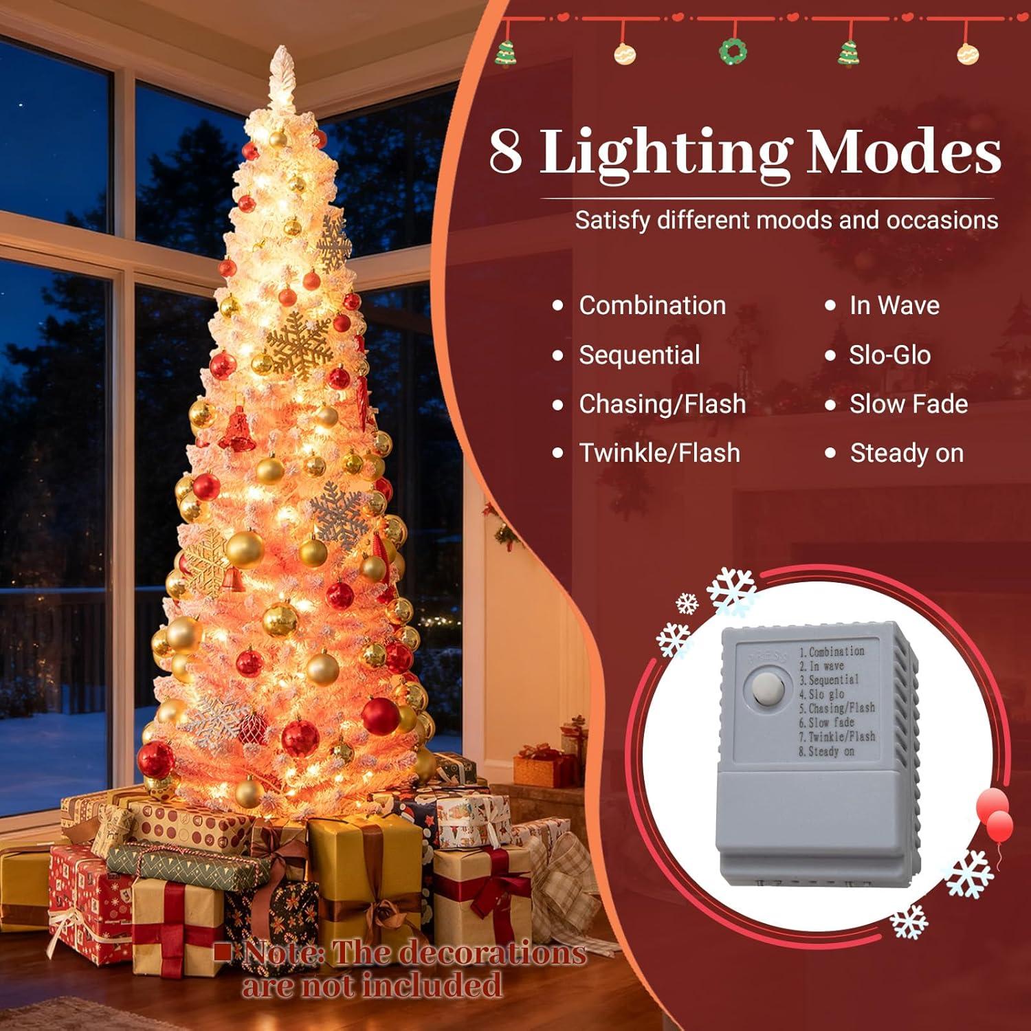 Versatile Lighting Options: The pre-lit Xmas tree is pre-strung with 140 warm white LED lights that distribute a soft, inviting glow throughout your space. With 8 lighting modes to select from, you can create everything from gentle twinkling to a steady shine, satisfying different moods and occasions.