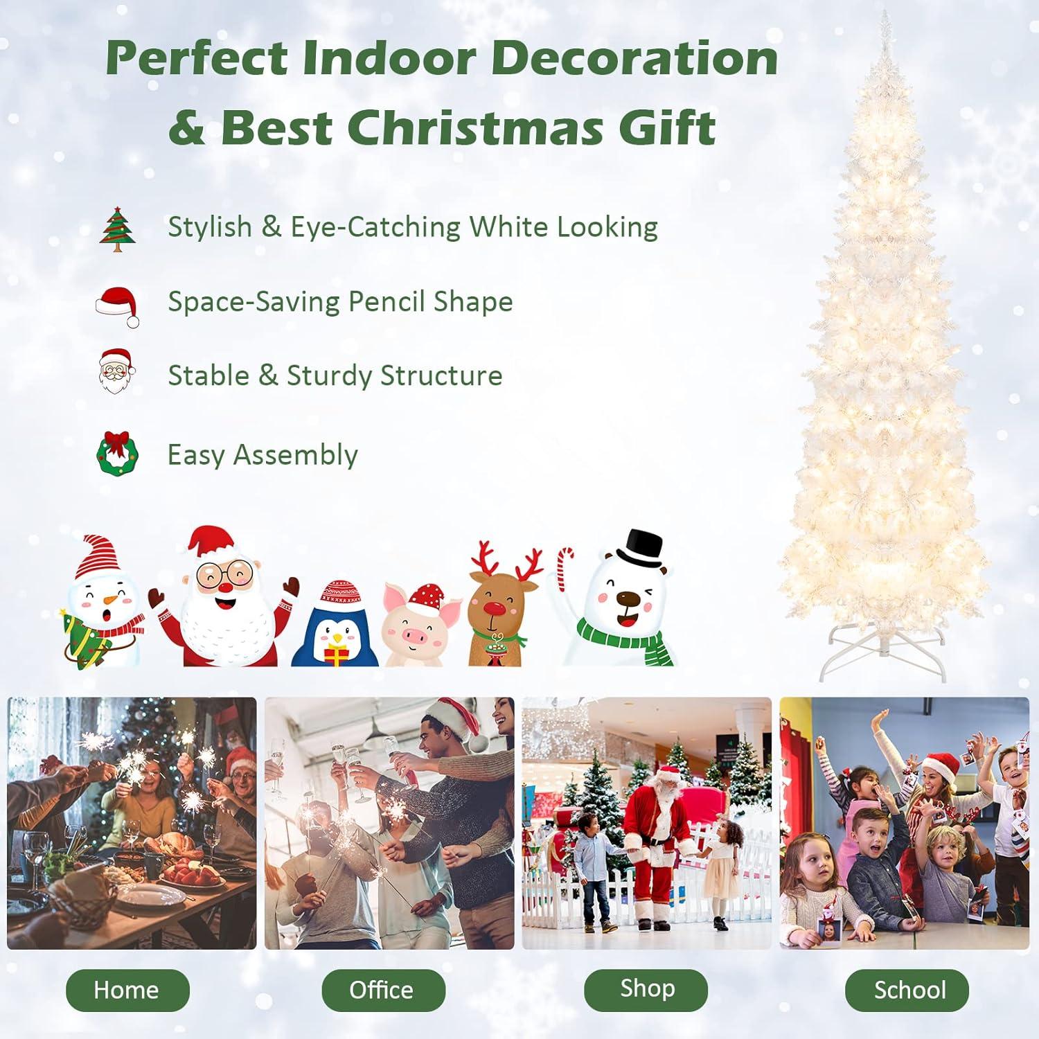Goplus 6ft Pink Slim Pencil Christmas Tree, Pre-lit Snow Flocked Artificial Skinny Xmas Tree with 140 Warm White LED Lights, 8 Lighting Modes, 392 Branch Tips & Metal Stand, Home Office Decoration(White-prelit)