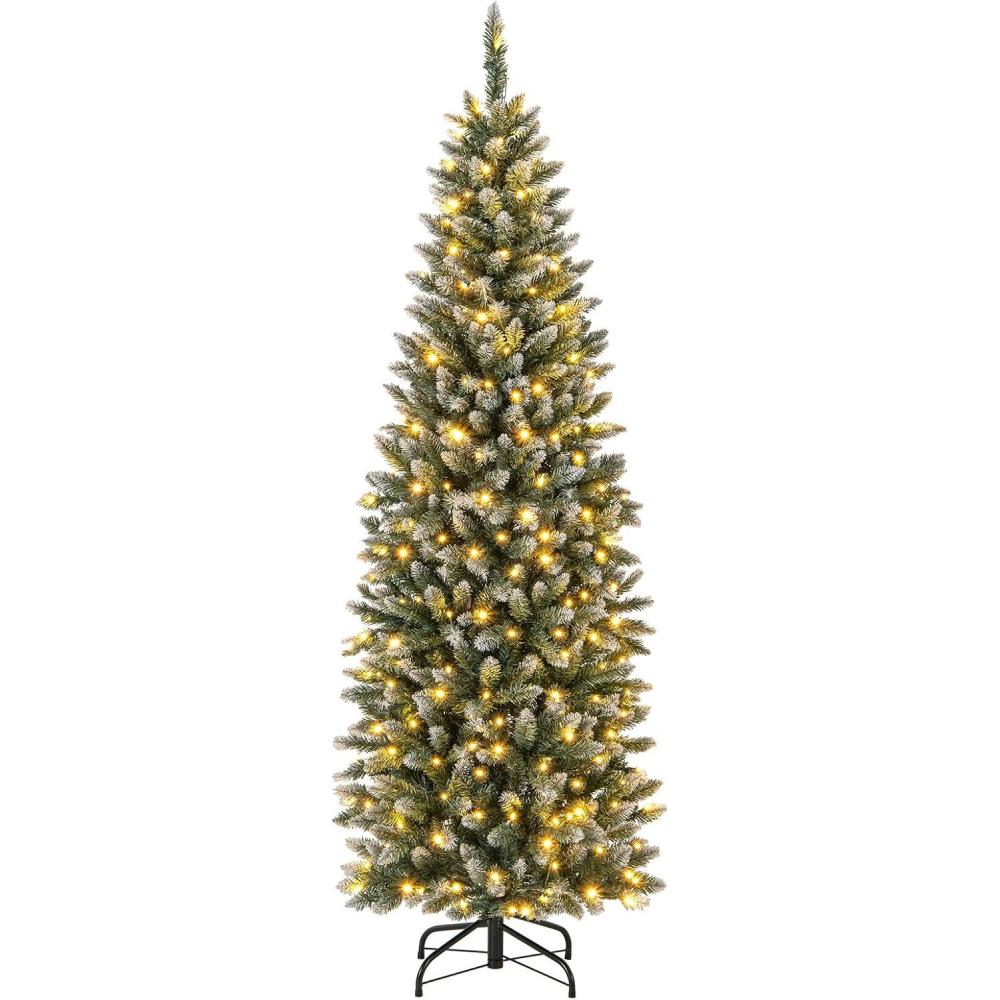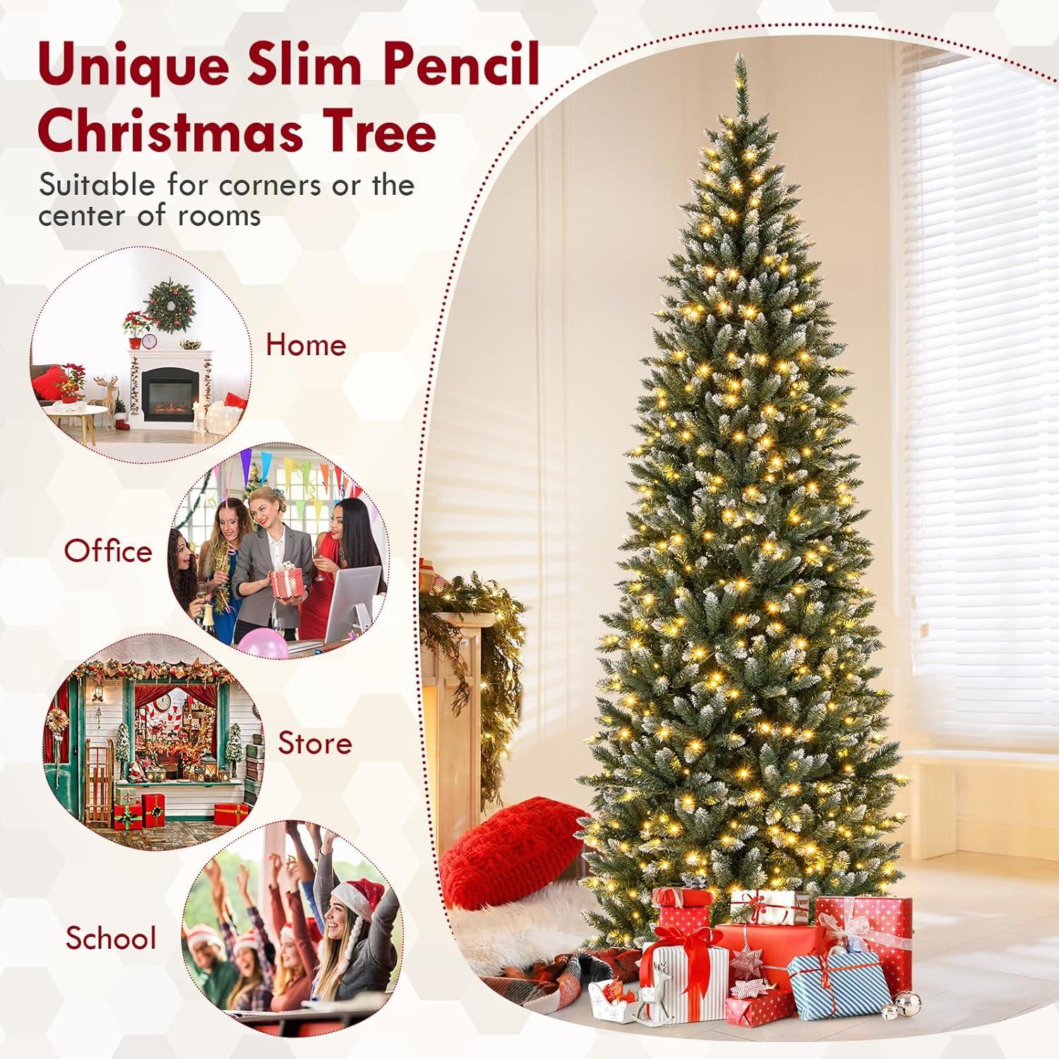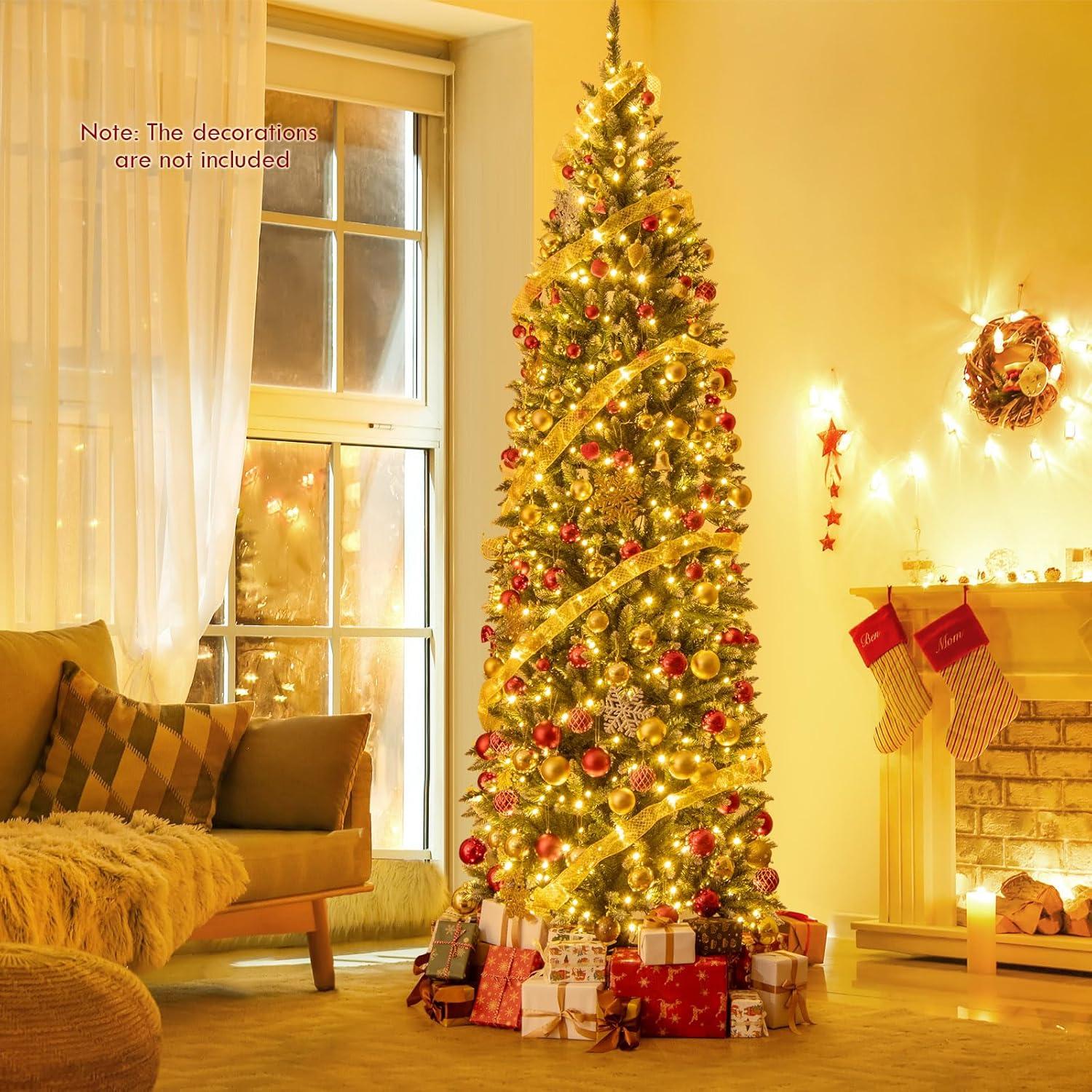 Boasting a super slim pencil tree silhouette, this 5/6/7/8/9 ft pre-lit artificial Christmas tree exudes elegance and sophistication, making it a captivating centerpiece for your celebrations. It comes with 296/390/499/591/699 lush green branch tips for a natural appearance and 150/180/200/300/400 warm white LED lights, creating a cozy and inviting atmosphere that sets the perfect holiday mood. Additionally, the leaves are crafted of 100% new PVC material, which is flame-retardant, odorless, and long-lasting. Supported by a sturdy crossed metal base, this tree stands securely to enhance your space with festive charm. Beyond Christmas, this versatile tree is perfect for various occasions, from weddings to birthdays, serving as a versatile and eye-catching decoration that adds a touch of charm to any setting.