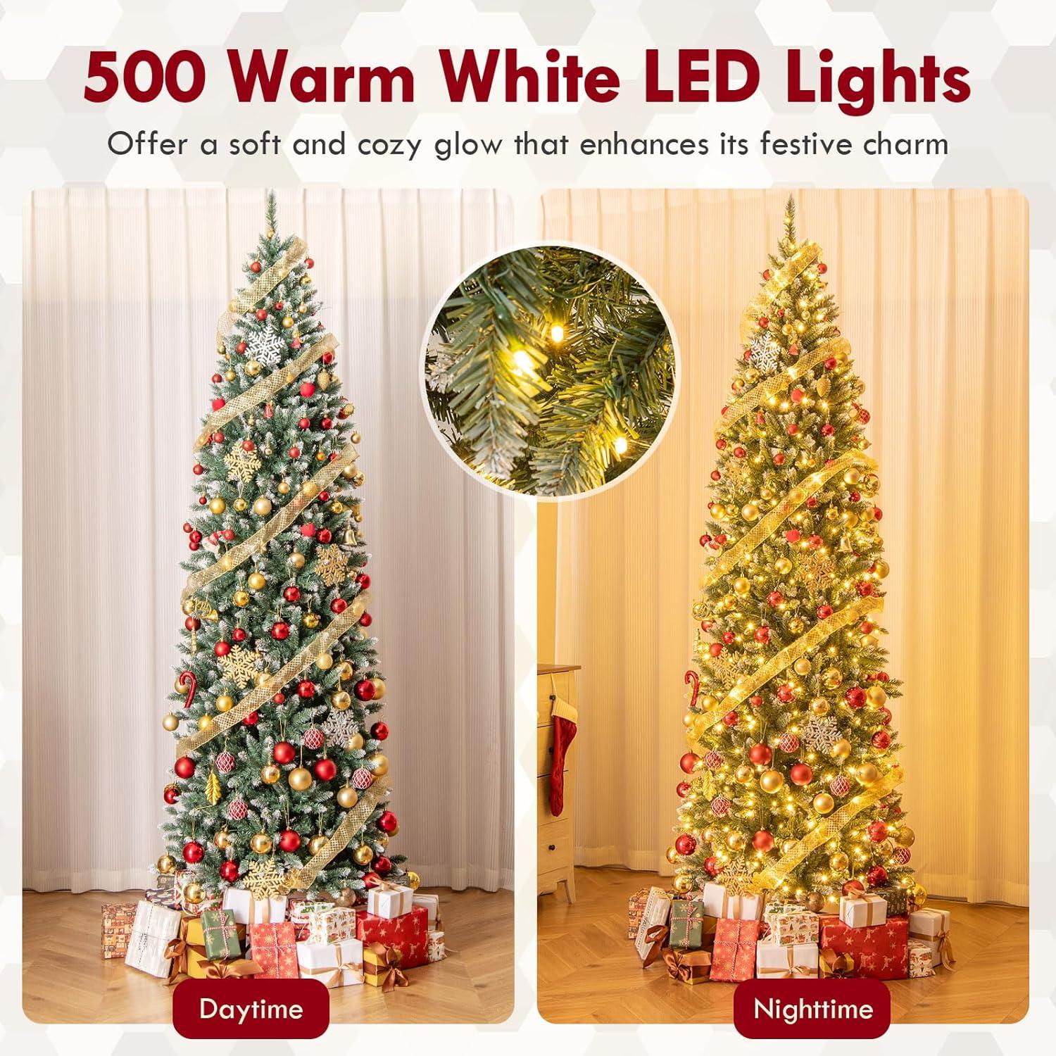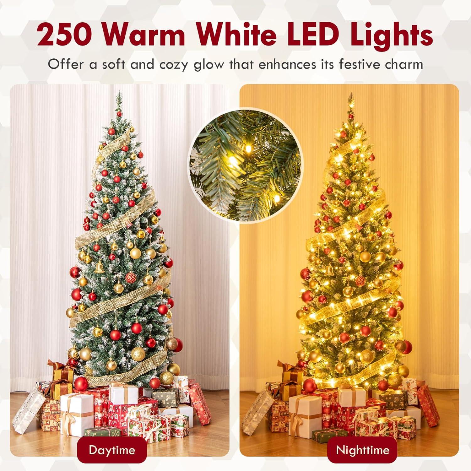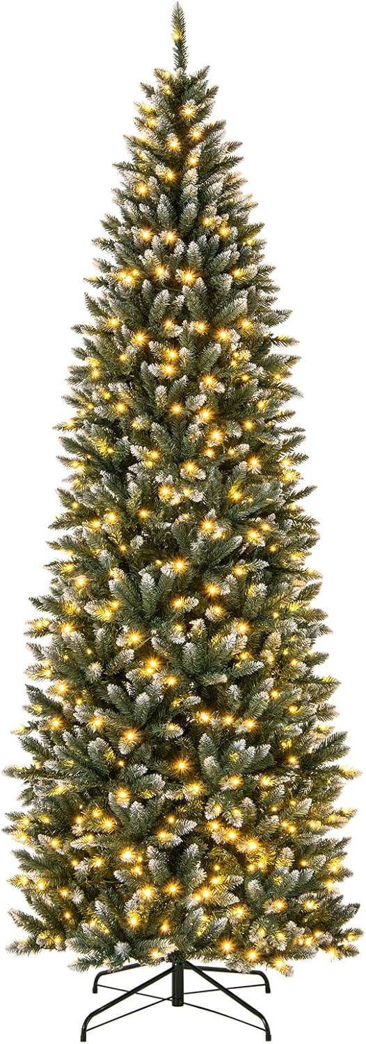 Boasting a super slim pencil tree silhouette, this 5/6/7/8/9 ft pre-lit artificial Christmas tree exudes elegance and sophistication, making it a captivating centerpiece for your celebrations. It comes with 296/390/499/591/699 lush green branch tips for a natural appearance and 150/180/200/300/400 warm white LED lights, creating a cozy and inviting atmosphere that sets the perfect holiday mood. Additionally, the leaves are crafted of 100% new PVC material, which is flame-retardant, odorless, and long-lasting. Supported by a sturdy crossed metal base, this tree stands securely to enhance your space with festive charm. Beyond Christmas, this versatile tree is perfect for various occasions, from weddings to birthdays, serving as a versatile and eye-catching decoration that adds a touch of charm to any setting.