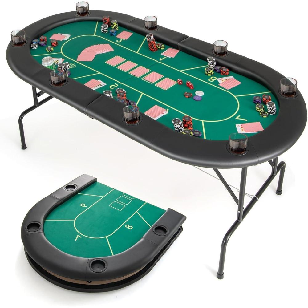 Our premium casino-grade poker table is designed to deliver an exceptional entertainment experience, featuring a smooth surface with outstanding noise reduction properties. It features 8 built-in cup holders, each measuring 3 inches, perfect for securing your drinks during intense gameplay. The table's sturdy metal frame is reinforced with reliable steel cables for stability, while non-slip pads and a stable triangular structure provide firm support on any surface. Additionally, padded armrests covered in waterproof polyurethane leather offer comfort and easy maintenance. It comfortably seats up to 8 players and folds away effortlessly when not in use, making it the perfect addition to any home gaming setup.