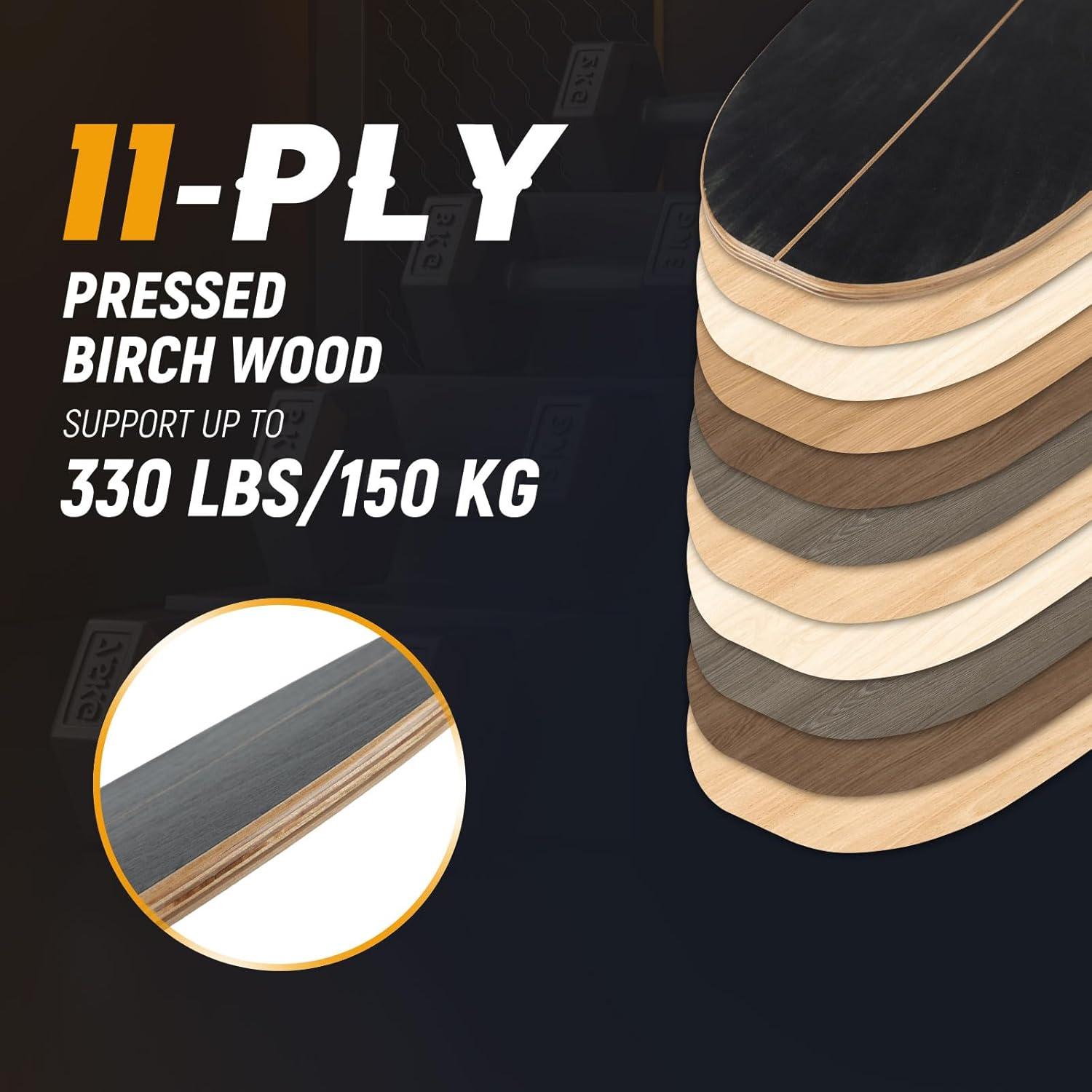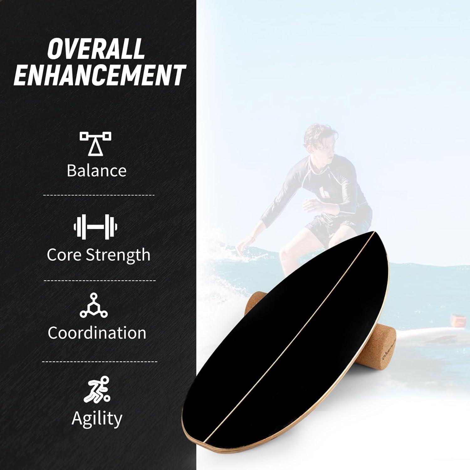 This balance training set features a balance board, cork roller, and a handy storage rack. Crafted from sturdy 11-ply pressed birch wood, the board can support up to 330 lbs. The wobble board is designed to challenge your stability, helping to strengthen your core, improve balance, and enhance coordination, posture, agility, and overall body awareness. Ideal for cross-training, this tool benefits various activities such as surfing, skateboarding, snowboarding, and team sports.