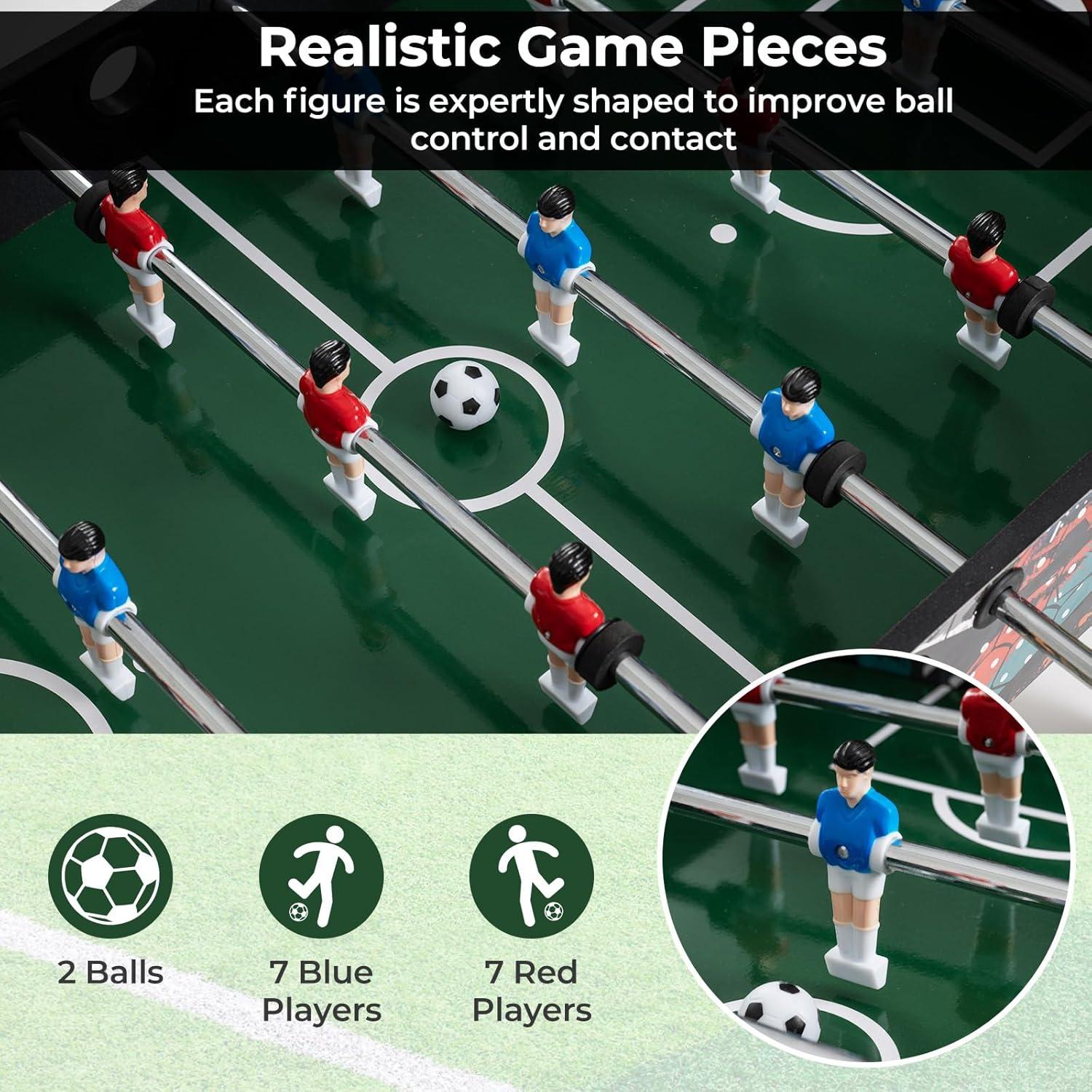 【Realistic & Engaging Design】 The football table features lifelike game pieces, including 2 balls, 7 blue players, and 7 red players, along with vibrant graphics for an authentic soccer atmosphere. It could promote quick thinking, hand-eye coordination, and teamwork.