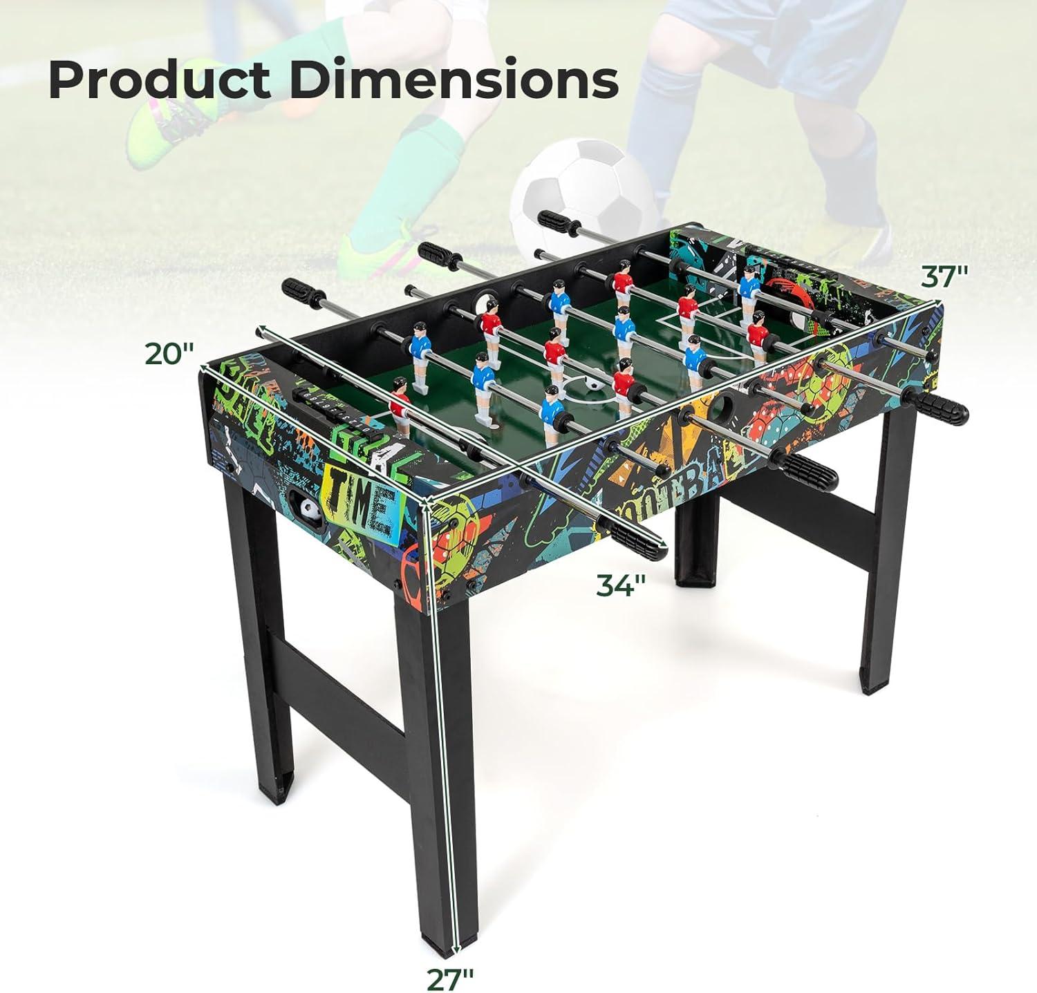 Our foosball table measures 34″ x 20″ x 27″/94 x 51 x 69 cm (L x W x H), which can be used as a freestanding centerpiece or easily transformed into a tabletop game, fitting perfectly in your living room, game room, office, or bar. Premium MDF construction and reinforced crossbars provide lasting stability, while carefully engineered anti-slip footpads keep the action steady. The smooth metal rods and non-slip handles ensure comfortable gripping and seamless player movement, making every match feel exciting and responsive. Vivid graphics and realistic player pieces create an authentic soccer atmosphere, transforming every round into an engaging experience. Great for family nights or friendly office competitions, this foosball table is designed to spark connection, build teamwork, and deliver hours of memorable entertainment.